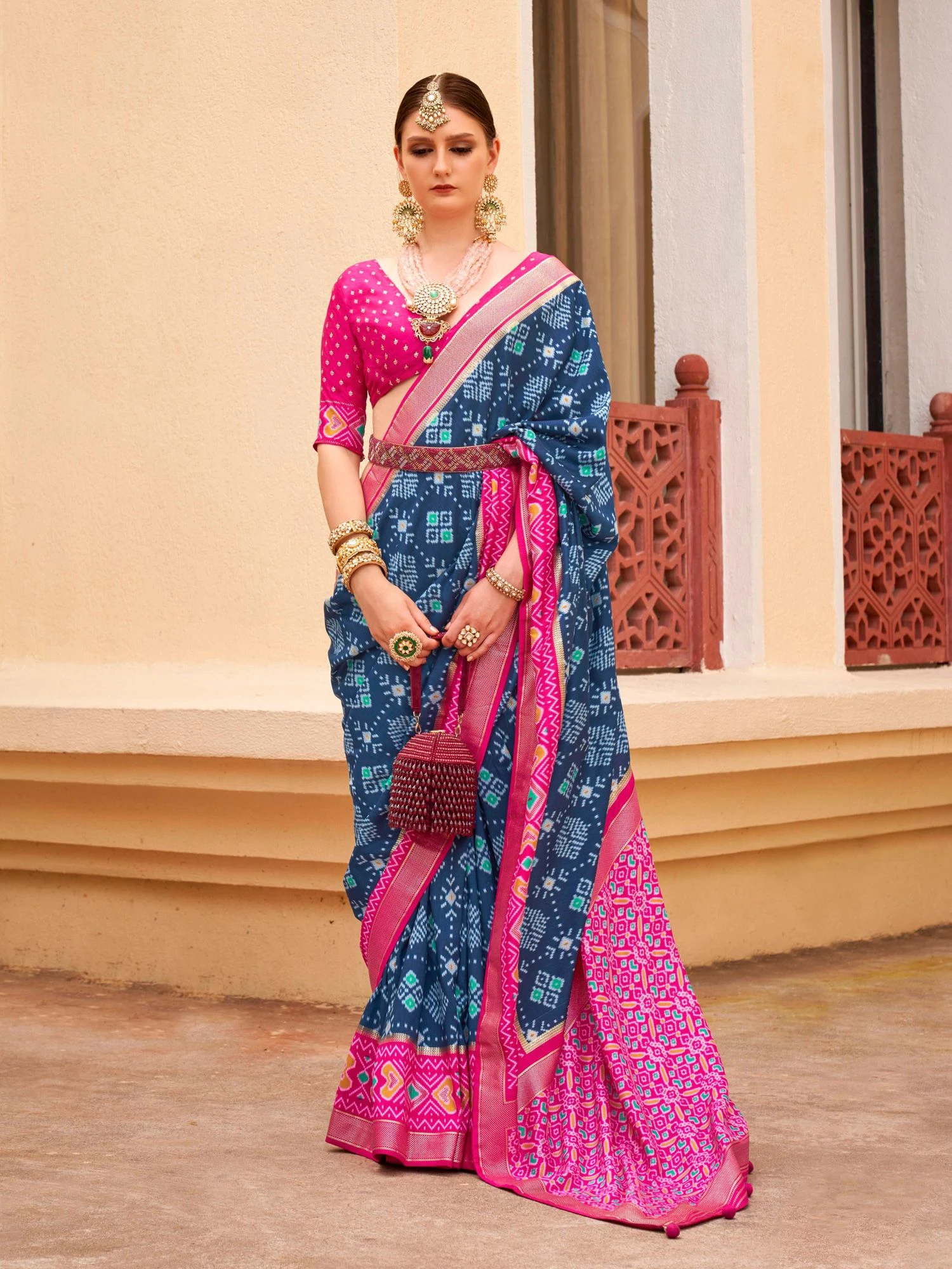 Add a story of tradition and beauty wearing this aegan blue color saree crafted in silk. Enhanced using printed patterns, showcasing distinstive borders and pallu. Comes with a matching pink color blouse in silk. Note: The accessories featured are purely for fashion purposes. Due to photography reasons, some color variations may occur. The un-stitched blouse may be customized up to 42 inches.