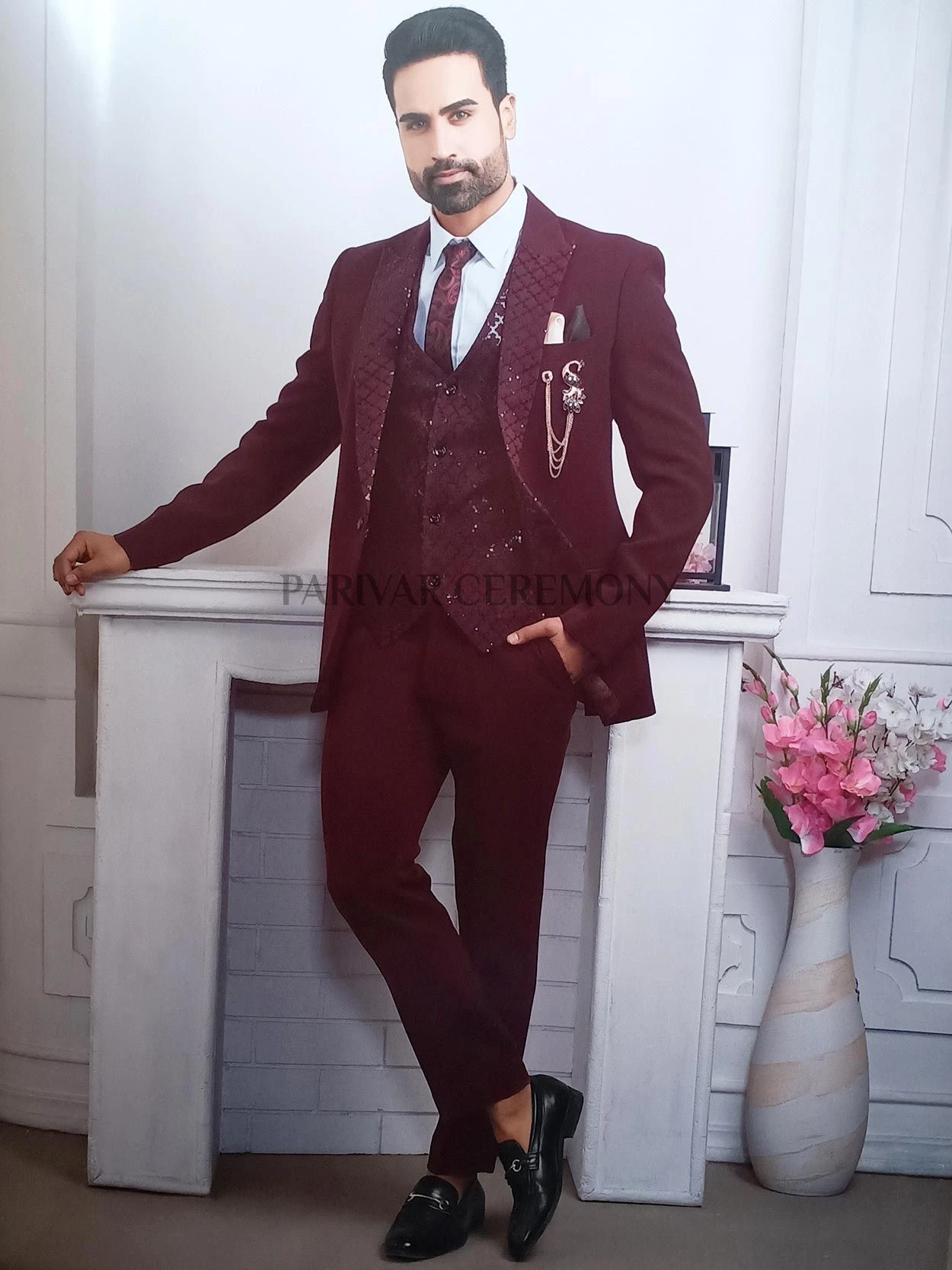 Auspicious Look Wine Colour Imported Fabric Mens Party Wear Suit.