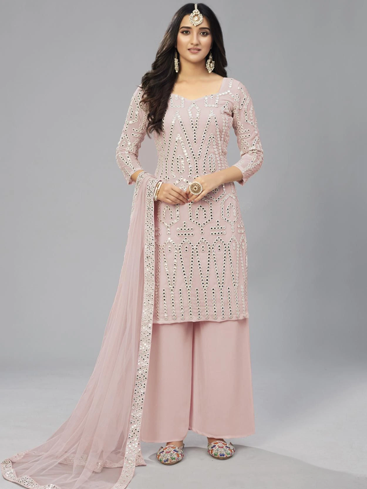 Palazzo Style Baby Pink Colour Georgette Fabric Wonderful Semi Stitched Salwar Kameez The lovely Thread,Mirror work a substantial attribute of this attire.