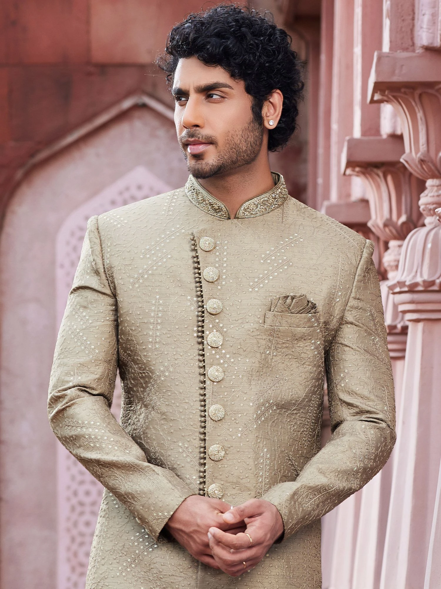 Paint your unique style and fashion adorning this beige color indowestern sherwani made in silk. Augmented using stones, sequins and thread embroidery work. Paired with off-white color churidaar in silk. Note: Some color variations may occur owing to photography causes. Up to 1 inch of measurement fluctuation is possible.