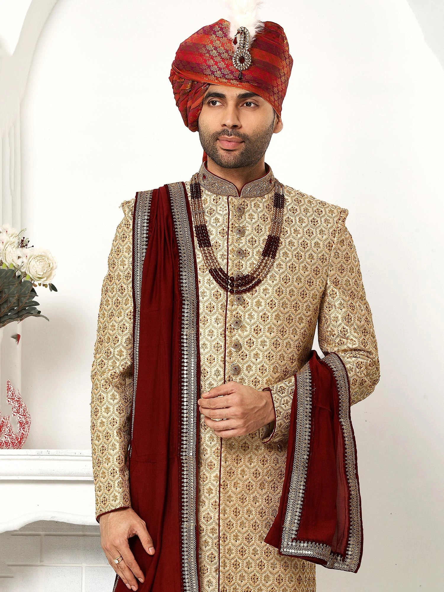 Look all traditional wearing this beige color sherwani made in art silk. Crafted using zari, sequins embroidery with stones embellishment work. Teamed with maroon color churidaar in dupion silk and a maroon embroidered stole. Note: Some color variations may occur owing to photography causes. Up to 1 inch of measurement fluctuation is possible.