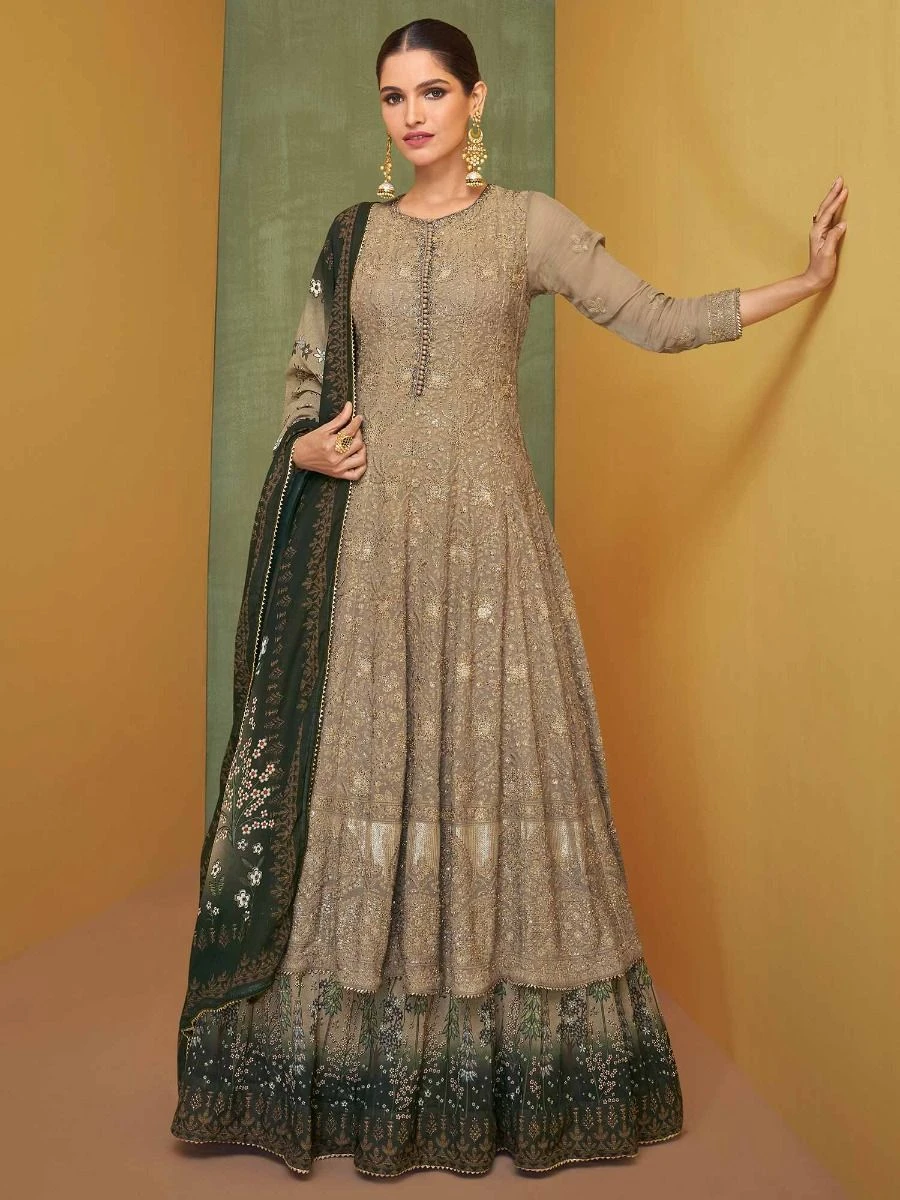 Showcasing this beige color anarkali suit in georgette. Designed using thread and stone embroidery all over. Teamed up with a matching printed georgette dupatta and a matching pair of bottom in shantoon. Note: Accessories shown are for styling purpose only. Slight color variation may occur due to photographic reasons. The semi-stitched kameez can be customised upto 42 inches.