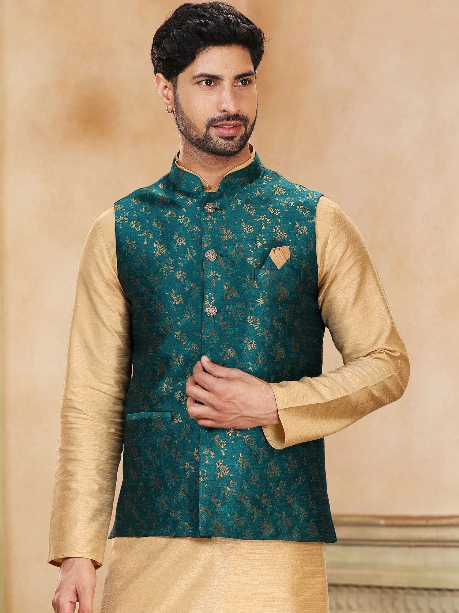 Look all festive and fine adorning this beige color kurta made in art silk. Topped with a deep green color jacquard nehru jacket enriched with woven details. Paired with a beige color churidaar pants in art silk. Note: Some color variations may occur owing to photography causes. Up to 1 inch of measurement fluctuation is possible.