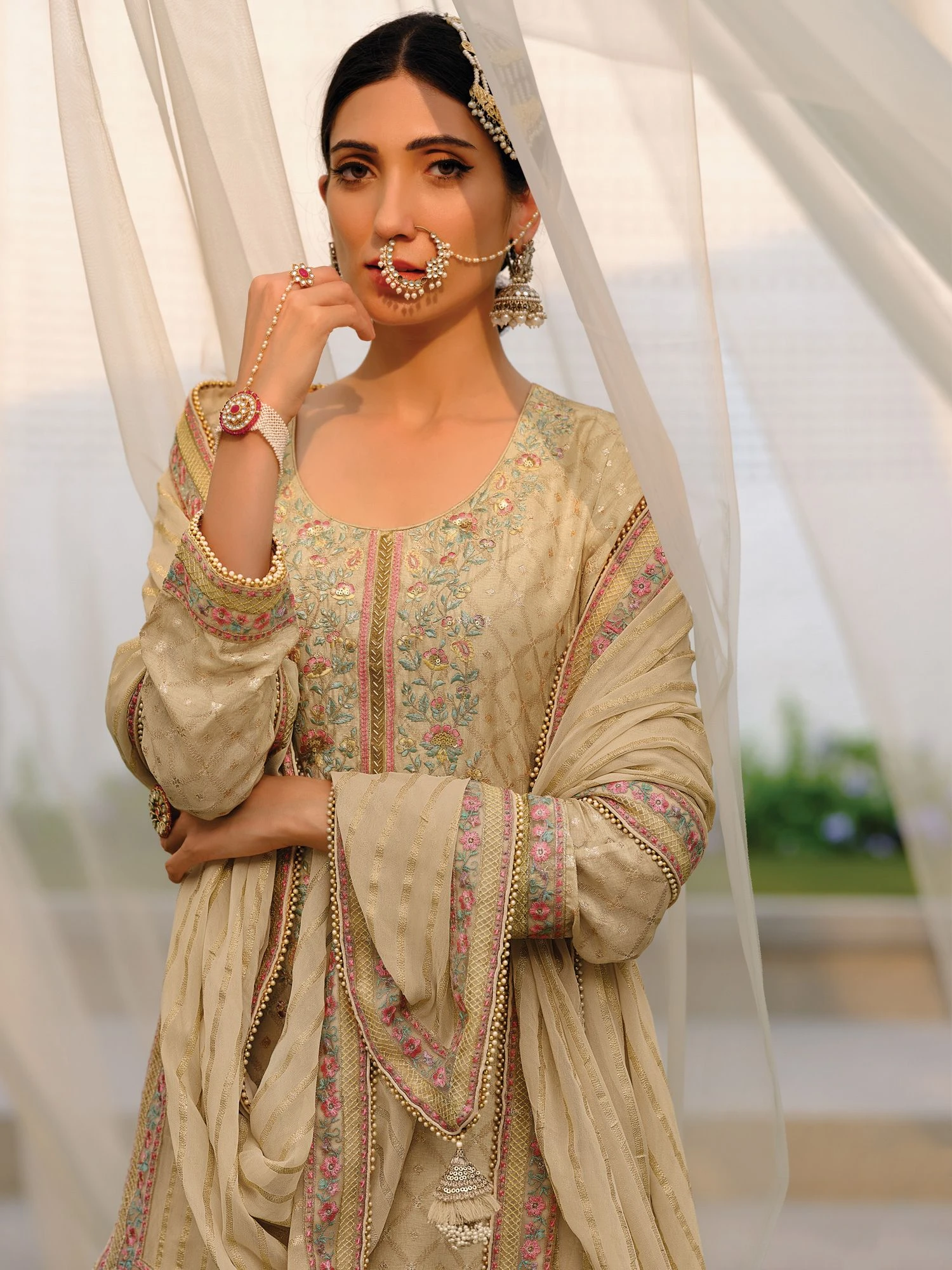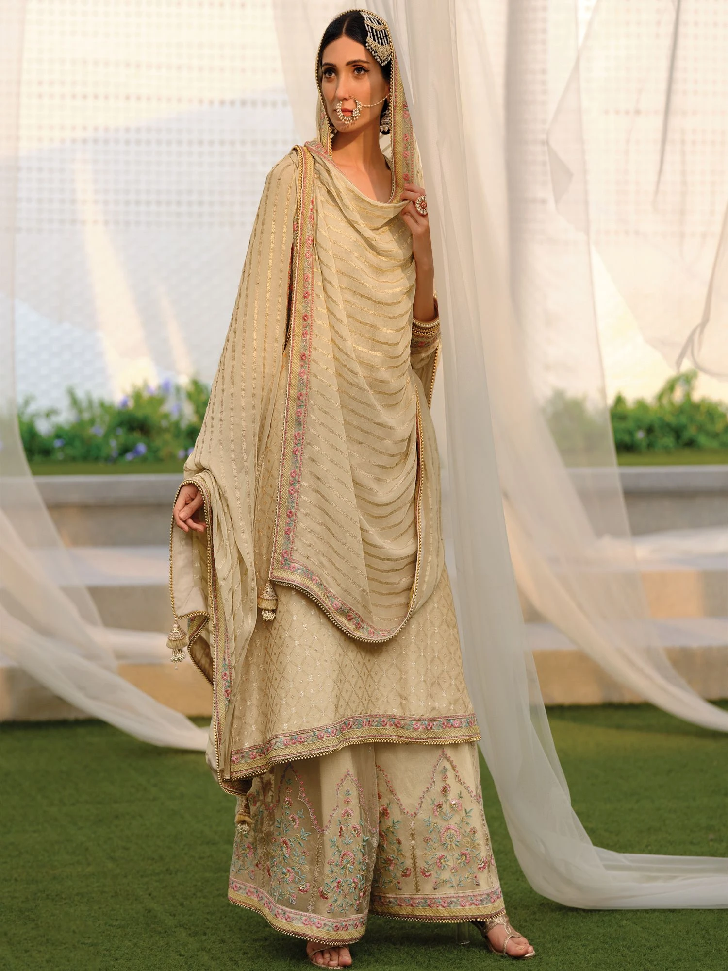 Exude major dreamy vibes with this beige color straight cut kameez in silk. Designed using silk woven with thread work and lace border. Paired with a georgette embroidered border dupatta and a palazzo style bottom, both made in beige color. Note: Accessories shown are for styling purpose only. Slight color variation may occur due to photographic reasons. The semi-stitched kameez can be customised upto 42 inches.