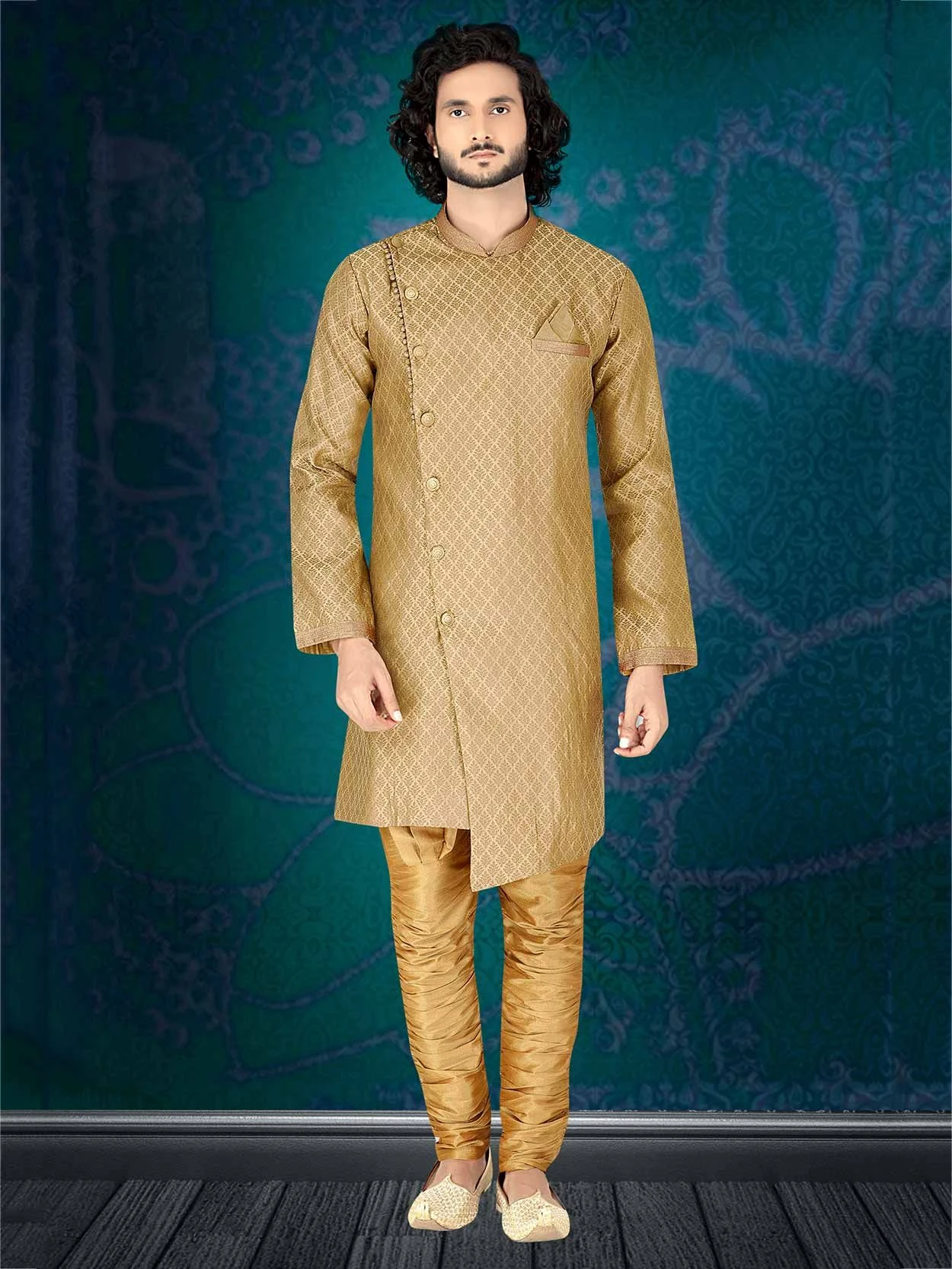 Ensure loads of envy along with admiration in this Beige,Golden Colour Jacquard Fabric Men’s Indo Western.