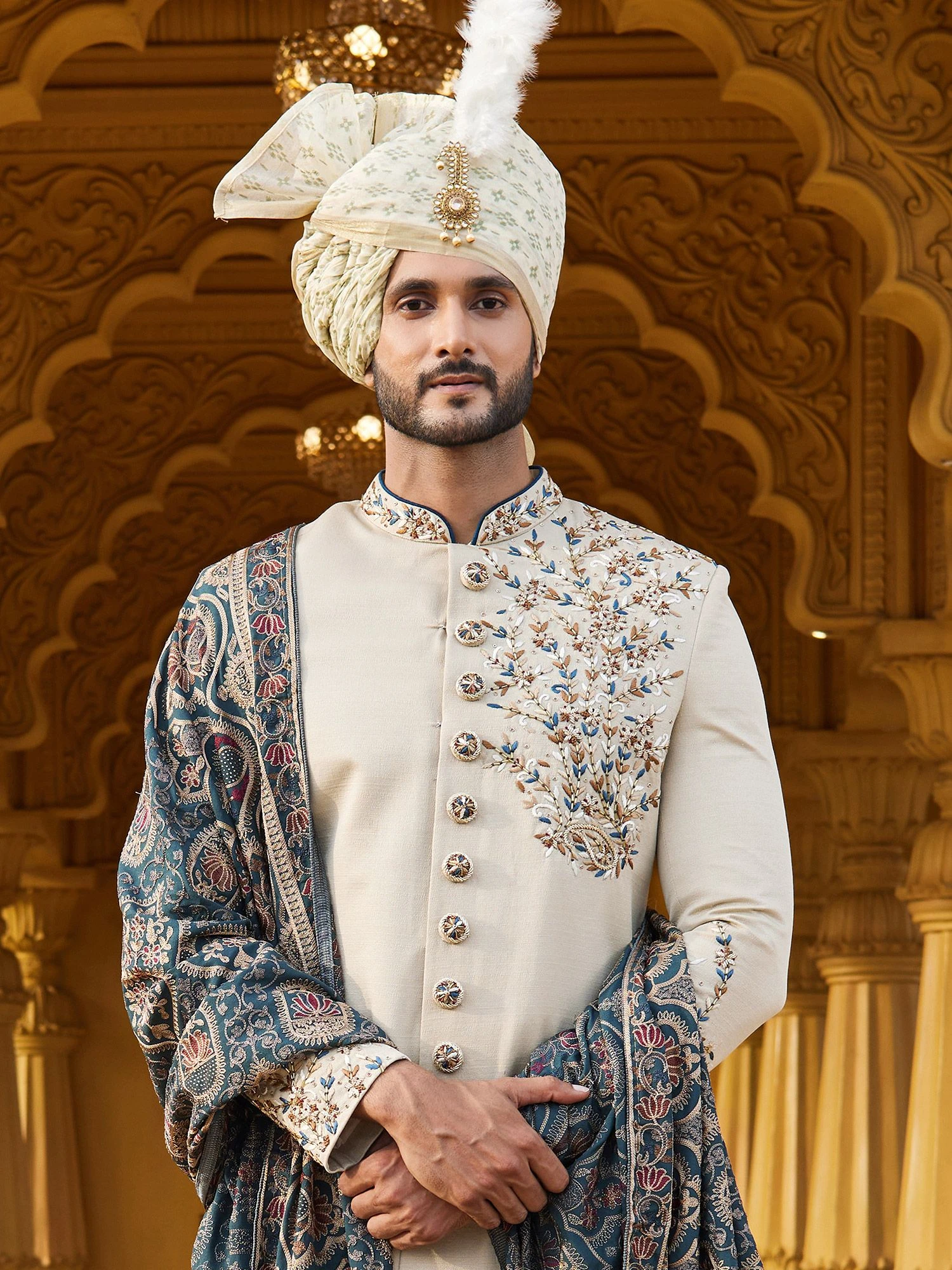 Spread a seamless blend of culture and style adorning this beige color sherwani made in silk. Augmented using thread and floral embroidery details. Assembled with white color churidaar in silk and an embroidered stole in dark blue color. Note: Some color variations may occur owing to photography causes. Up to 1 inch of measurement fluctuation is possible.