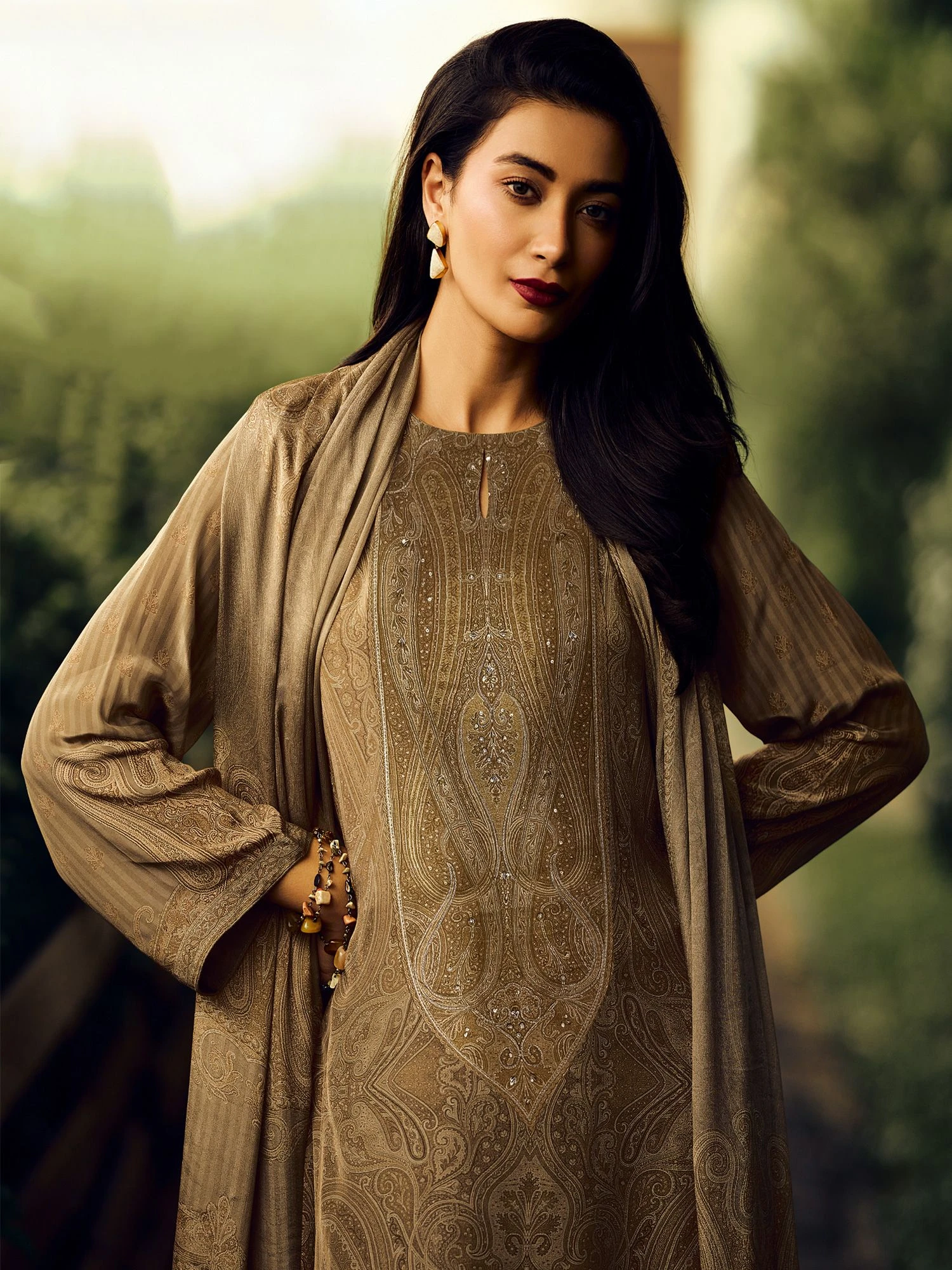 Own your effortless style as you wear this camel beige color straight cut kameez in pashmina silk. Designed using digitally printed embroidery all over. Paired with a pashmina silk dupatta and a palazzo style bottom, both made in beige color. Note: Accessories shown are for styling purpose only. Slight color variation may occur due to photographic reasons. The semi-stitched kameez can be customised upto 42 inches.