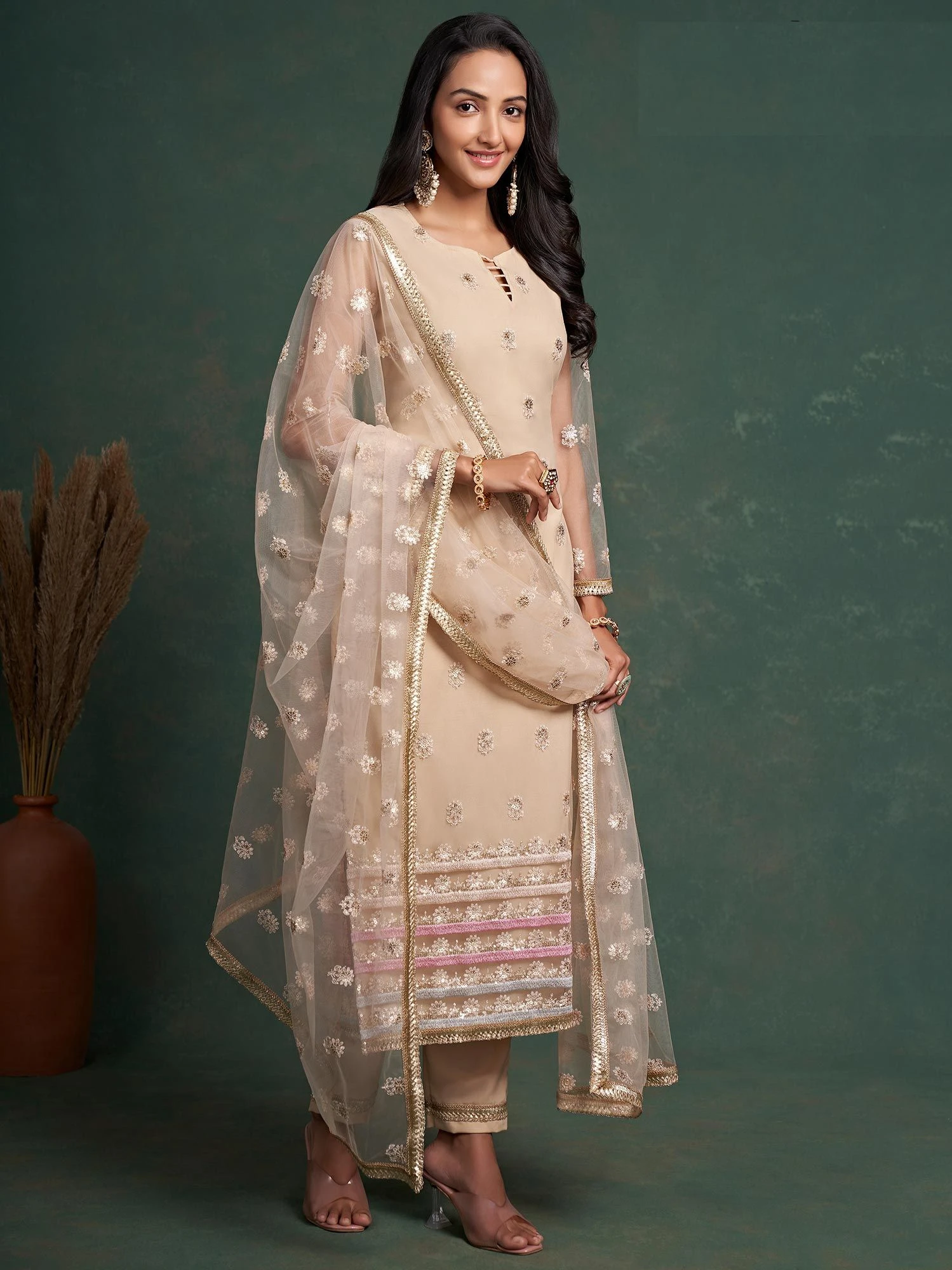 Step into the spotlight adorning this soft beige color straight cut kameez in net. Crafted using sequins, zari and thread work embroidery all over. Available with a beige net dupatta and a matching pants in crepe. Note: Accessories shown are for styling purpose only. Slight color variation may occur due to photographic reasons. The semi-stitched kameez can be customised upto 42 inches.