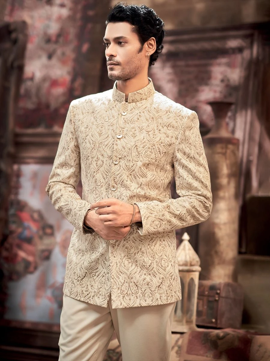 Upgrade your ethnic wardrobe with this cream color jodhpuri suit made in silk. Enhanced with a woven style and buttoned up front. Comes with a matching cream trousers in silk. Note: Some color variations may occur owing to photography causes. Up to 1 inch of measurement fluctuation is possible.