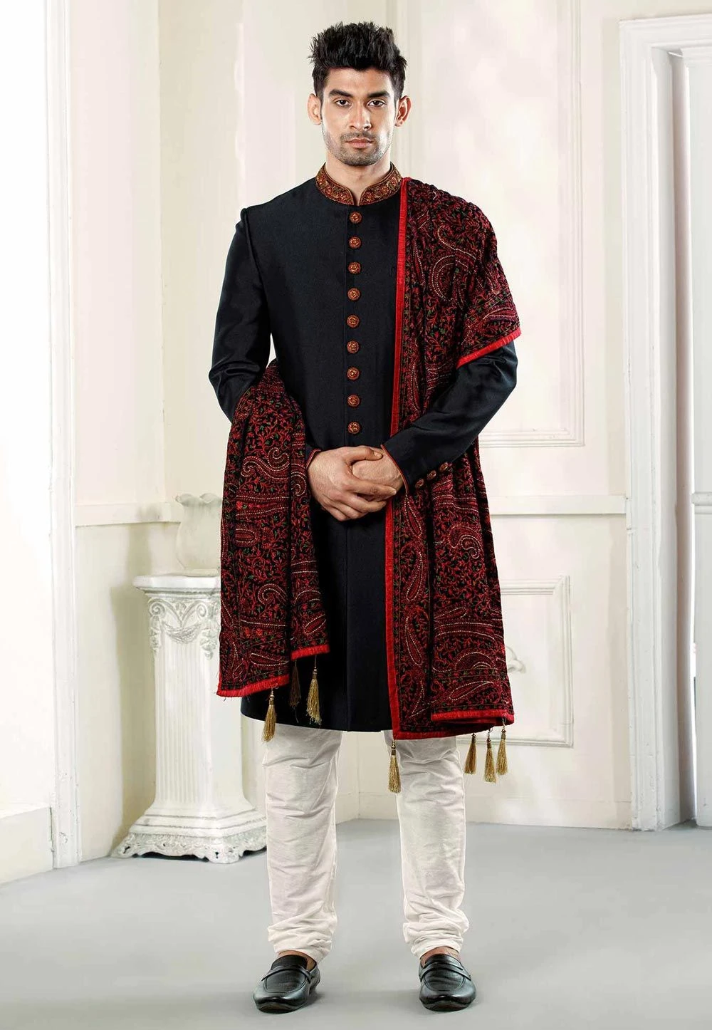 Feel different wearing this designer achkan sherwani with heavy embroidered shwal/dupatta with the same work as on collar and buttons.It is an ideal wedding worthy ensemble worn by grooms or grooms men