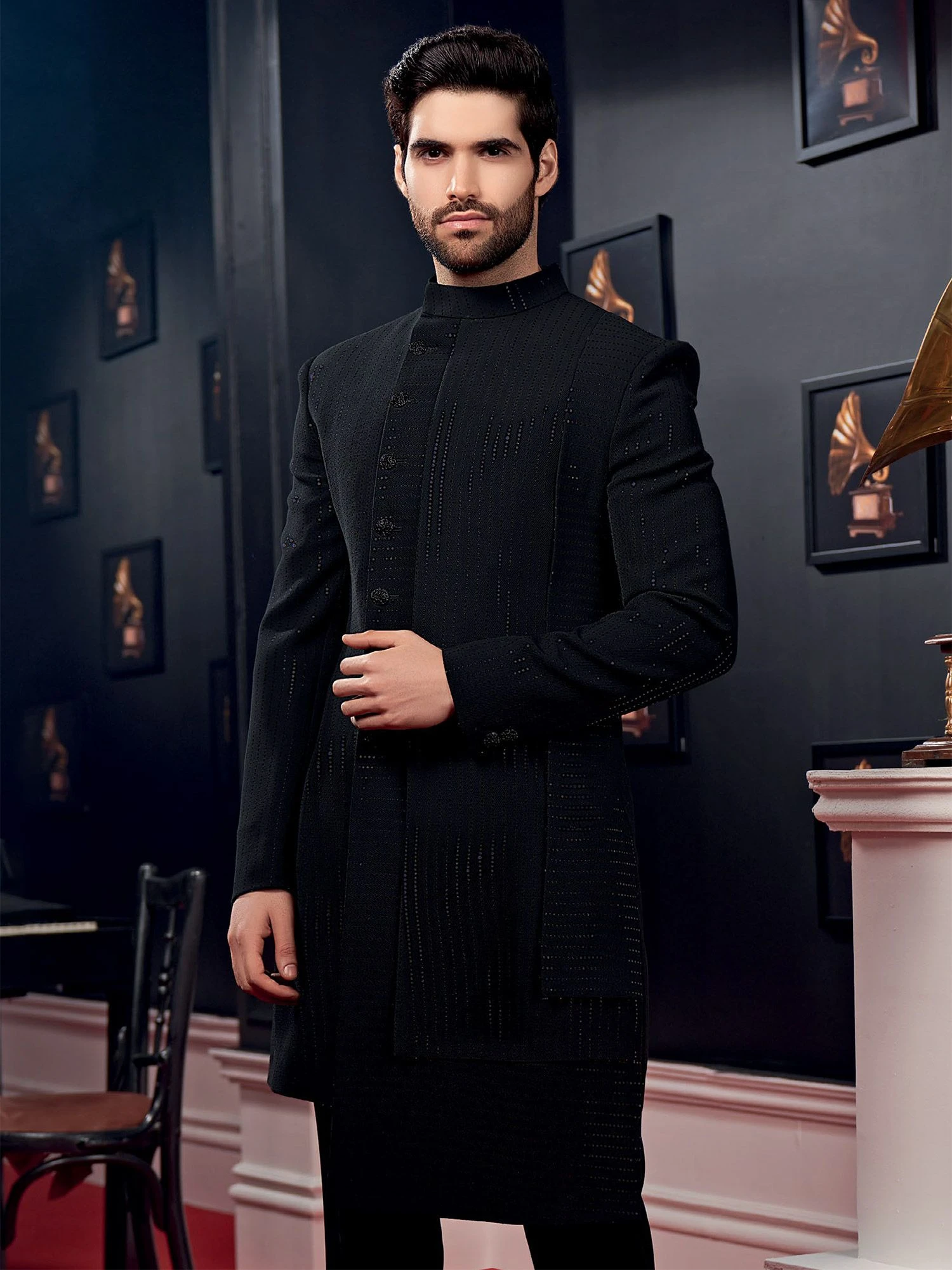 Exude effortless elegance adorning this black color asymmetric indo western made in italian fabric. Curated using lush stone embellishmnets all over. Teamed with black color trousers in italian fabric. Note: Some color variations may occur owing to photography causes. Up to 1 inch of measurement fluctuation is possible.
