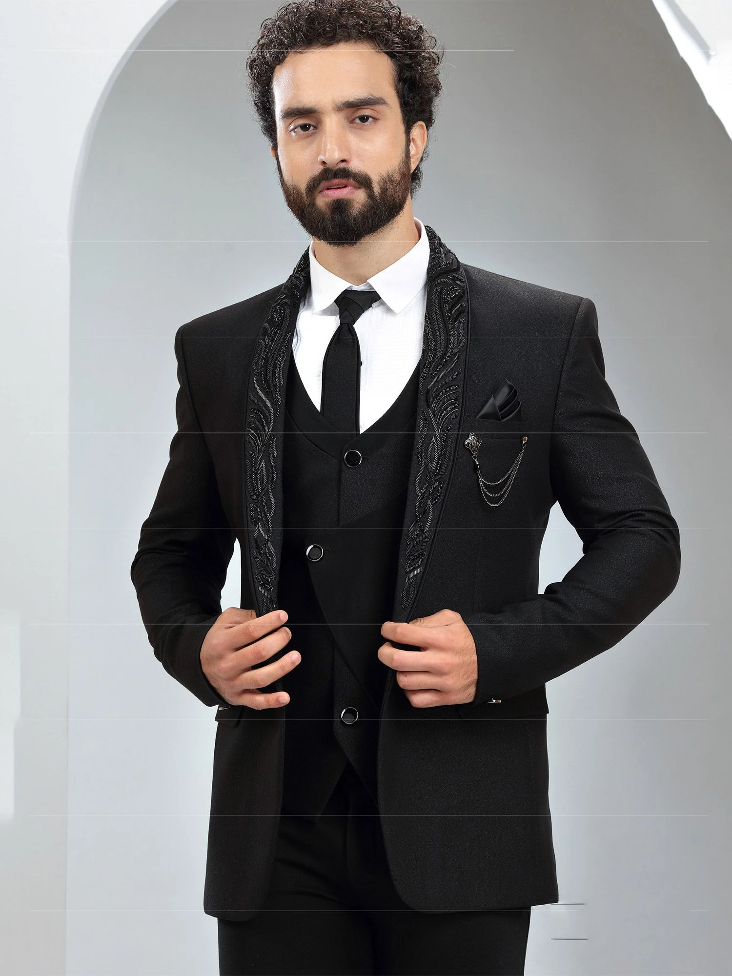 Experience the art of self-expression adorning this black color three piece suit made in italian fabric. Furnished with hand embridered work. Paired with a white cotton shirt, tie and a matching black color pant. Note: Some color variations may occur owing to photography causes. Up to 1 inch of measurement fluctuation is possible.