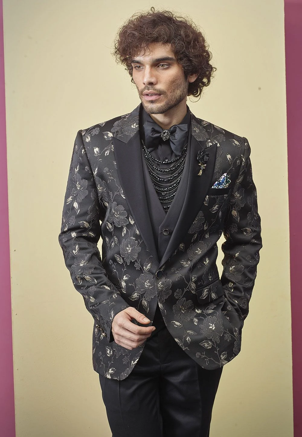 Imported Fabric Black Colour Imported Fabric Flower Printed Tuxedo Suit.