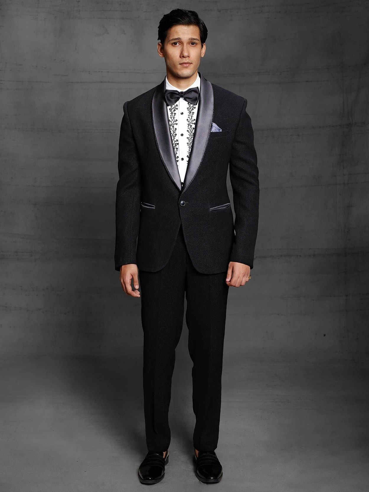Fabulous Looking Black Colour Imported Fabric Designer Groom Suit With Hand Work.