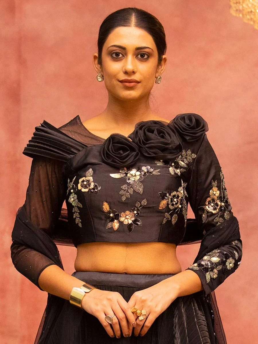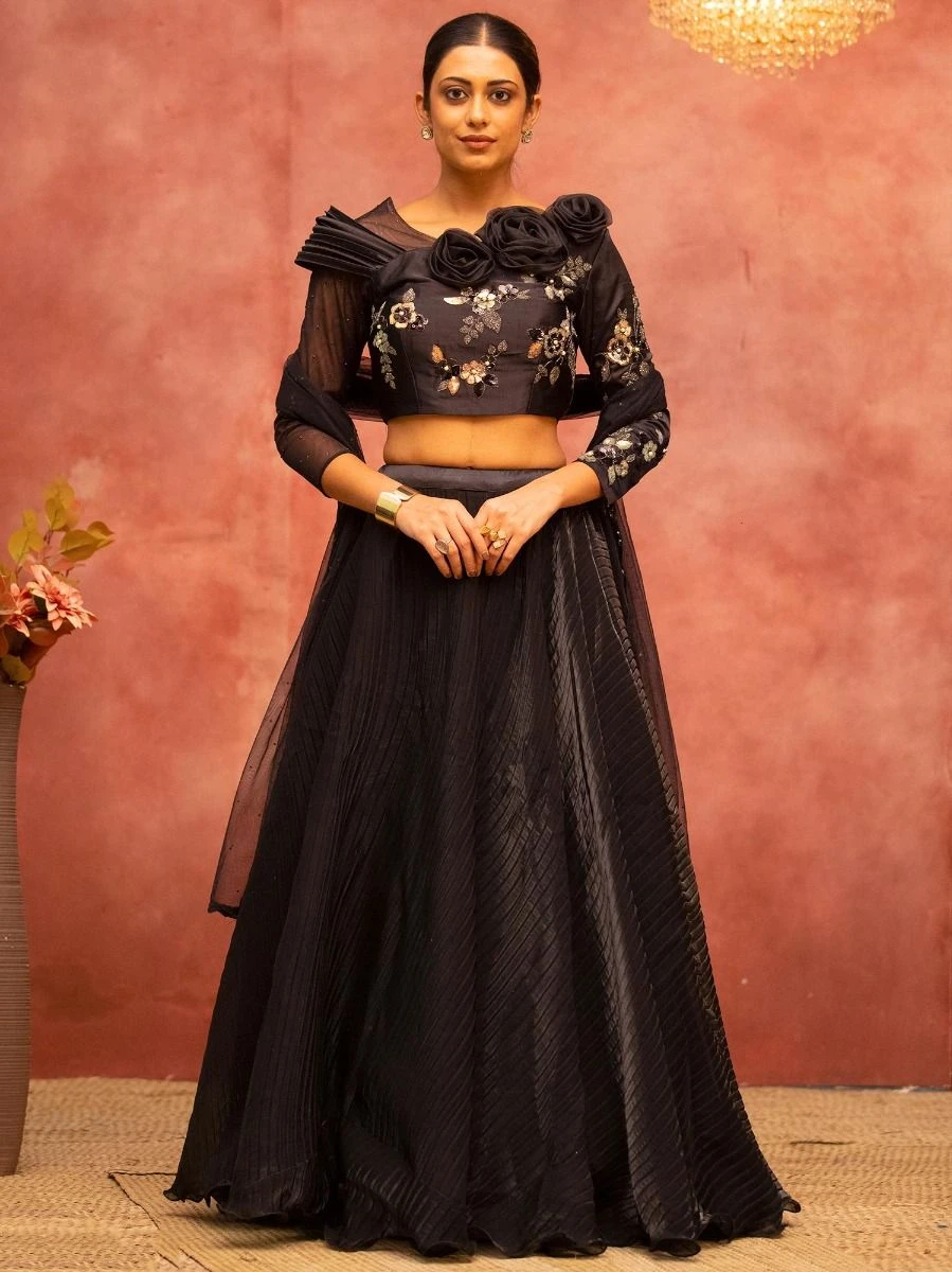 Get all the diva vibes wearing this black color lehenga in satin. Decorated with crushed patterned ruffles. Available with a matching hand embroidered choli in satin and a ruffle dupatta made in net. Note: The accessories featured are purely for fashion purposes. Due to photography reasons, some color variations may occur. The semi-stitched choli and lehenga waist may be customized up to 42 inches.