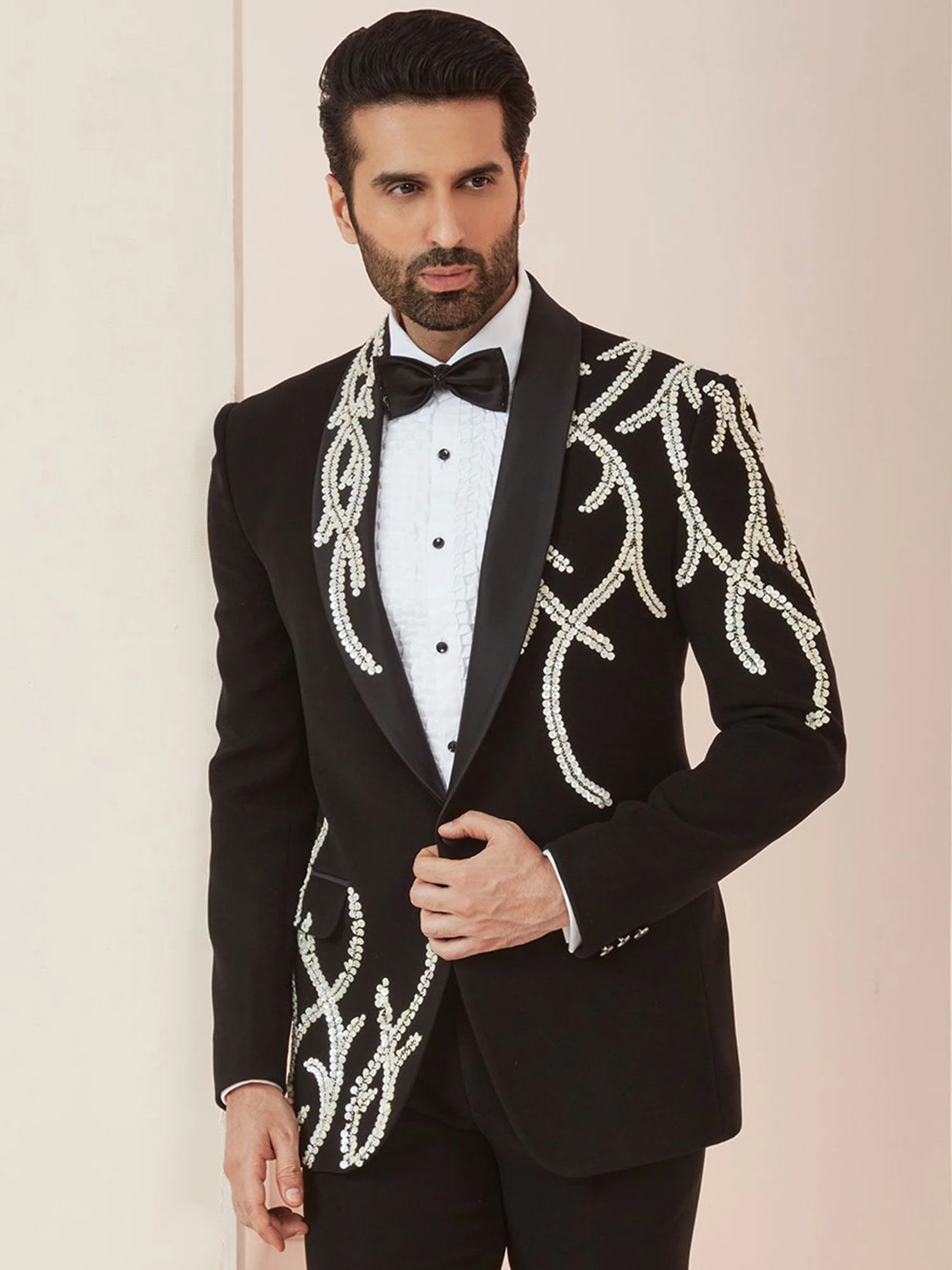 Make a remarkable entrance adorning this black color tuxedo made in italian fabric. Decorated with hand embroidery work. Styled with a white cotton shirt, bow tie and a matching black trousers. Note: Some color variations may occur owing to photography causes. Up to 1 inch of measurement fluctuation is possible.