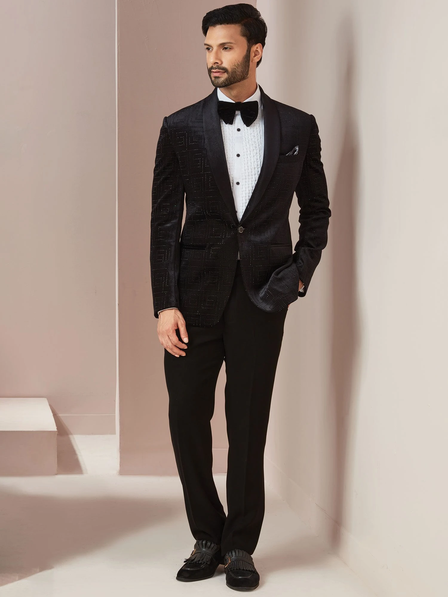 Be in the spotlight adorning this black color tuxedo made in italian fabric. Decorated with thread embroidery and hand work. Teamed with a white cotton shirt, bow tie and a matching black trousers. Note: Some color variations may occur owing to photography causes. Up to 1 inch of measurement fluctuation is possible.