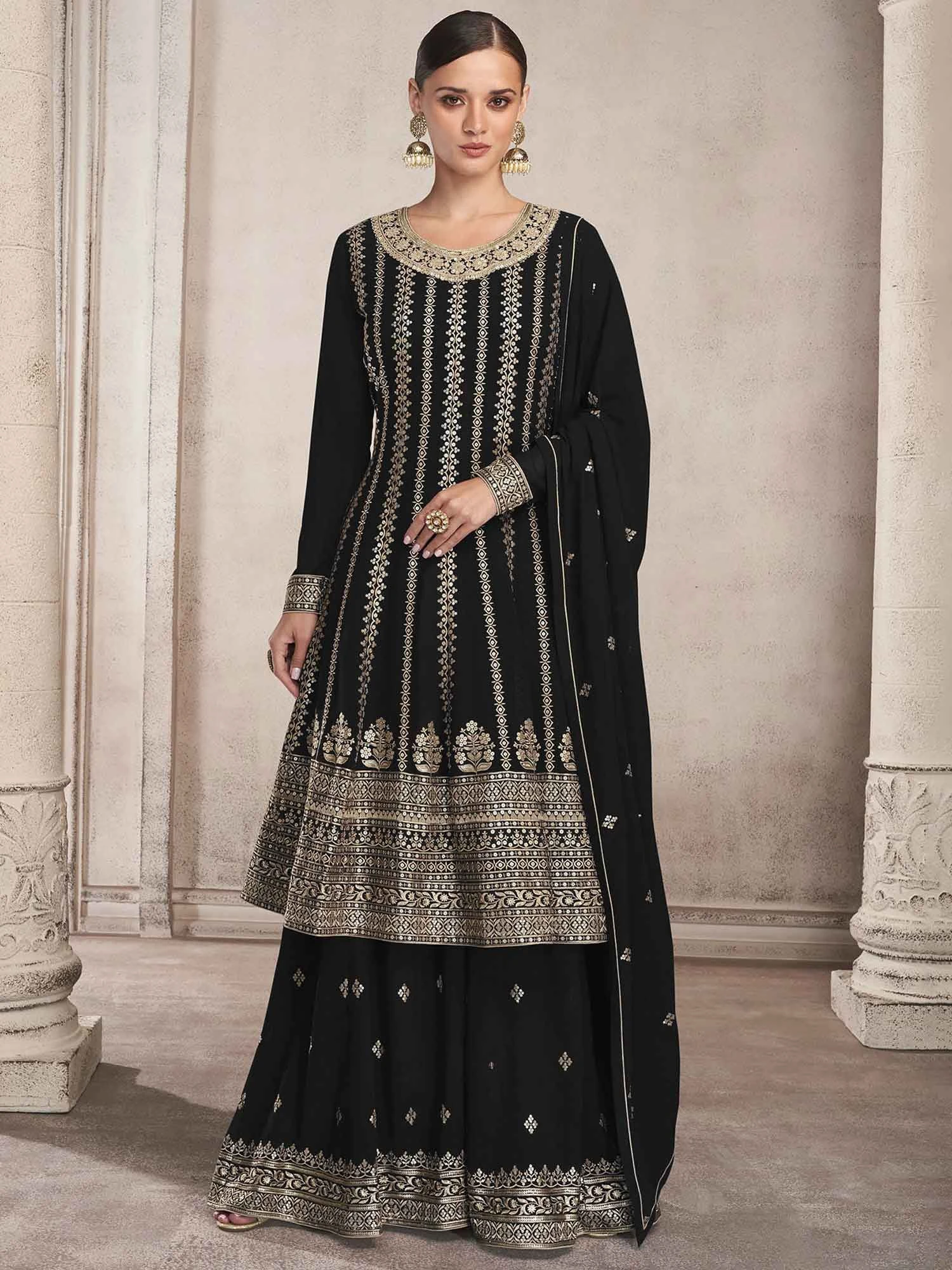 Create a regalia adorning this black color flared kameez in georgette. Designed using thread, zari and sequins embroidery all over. Teamed with a matching georgette dupatta and a matching sharara in georgette. Note: Accessories shown are for styling purpose only. Slight color variation may occur due to photographic reasons. The semi-stitched kameez can be customised upto 42 inches.