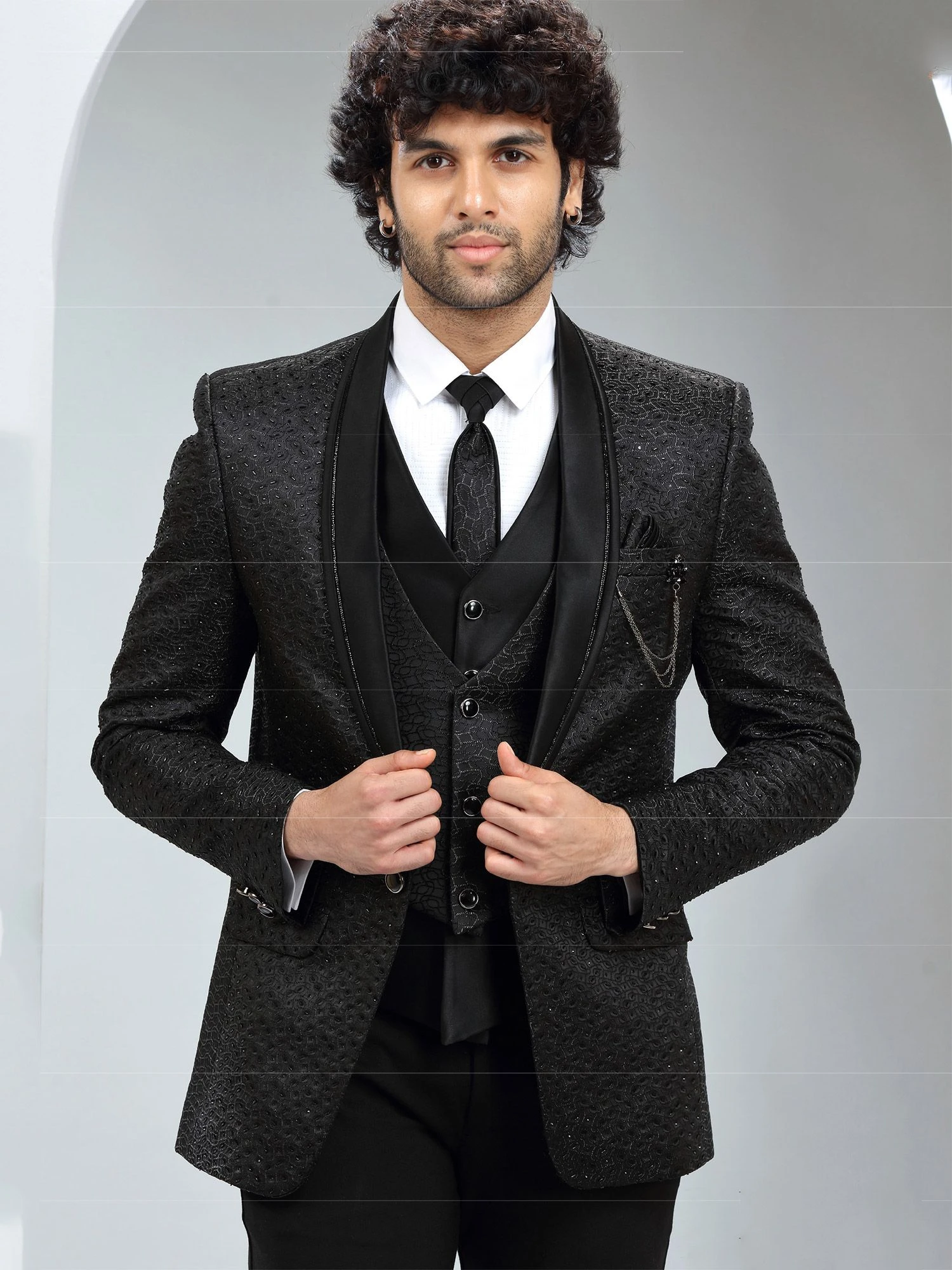 Fashion and trend would be on the peak with this black color three piece suit made in italian fabric. Furnished with stone embroidered embellishments. Paired with a white cotton shirt, tie and a matching black color pant. Note: Some color variations may occur owing to photography causes. Up to 1 inch of measurement fluctuation is possible.
