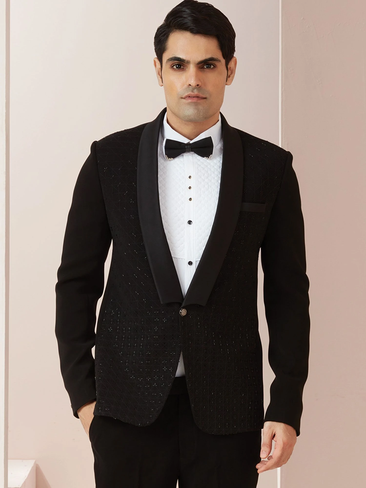 Get a squeaky clean look adorning this black color tuxedo made in italian fabric. Augmented with thread and hand embroidery work. Comes with a white cotton shirt, bow tie and a matching black trousers. Note: Some color variations may occur owing to photography causes. Up to 1 inch of measurement fluctuation is possible.