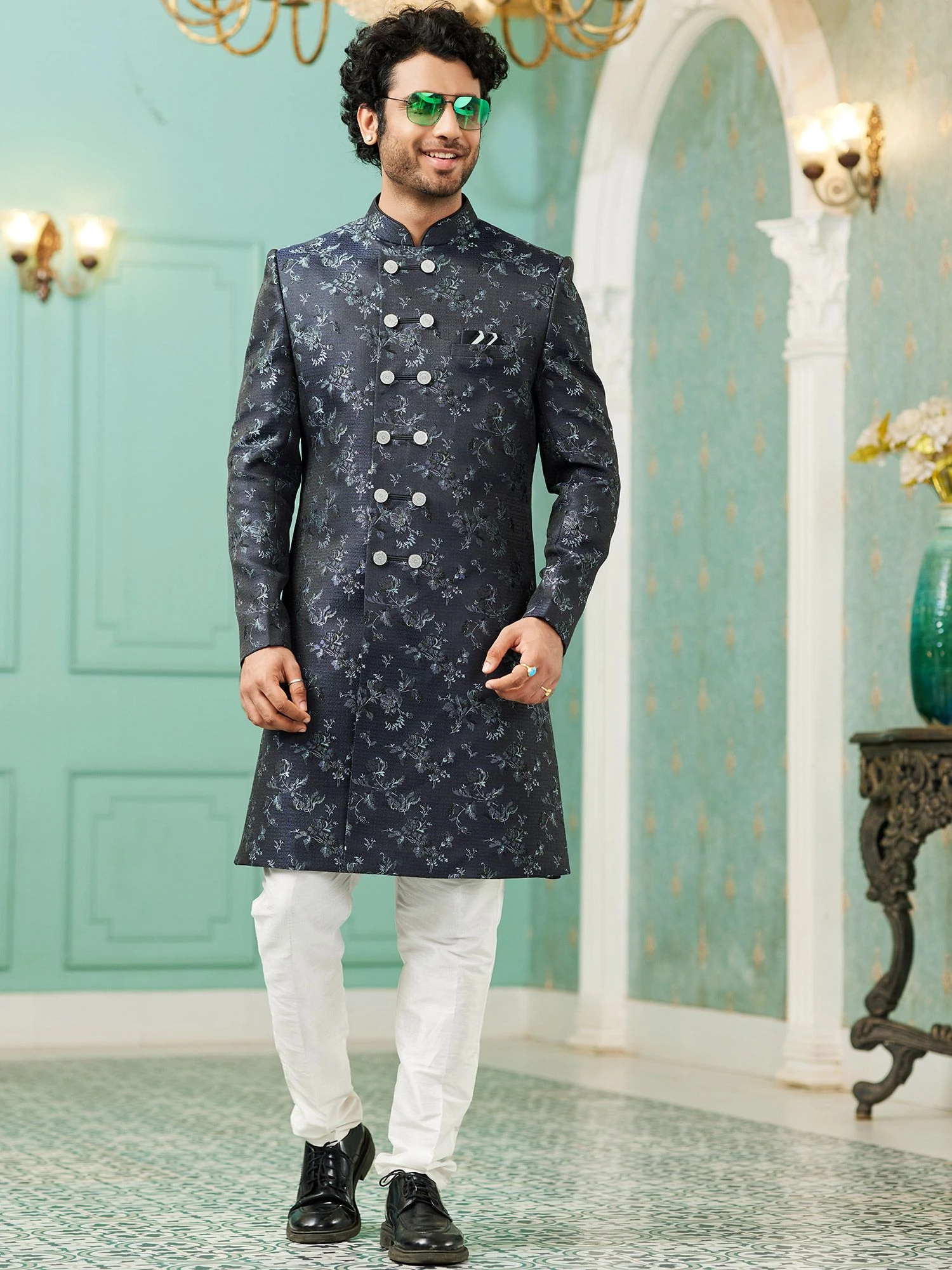 Spreading the sparking vibes adorning this black color sherwani fabricated in jacquard. Designed using floral weaving embroidery work. Paired with white color churidar in dupion silk. Note: Some color variations may occur owing to photography causes. Up to 1 inch of measurement fluctuation is possible.