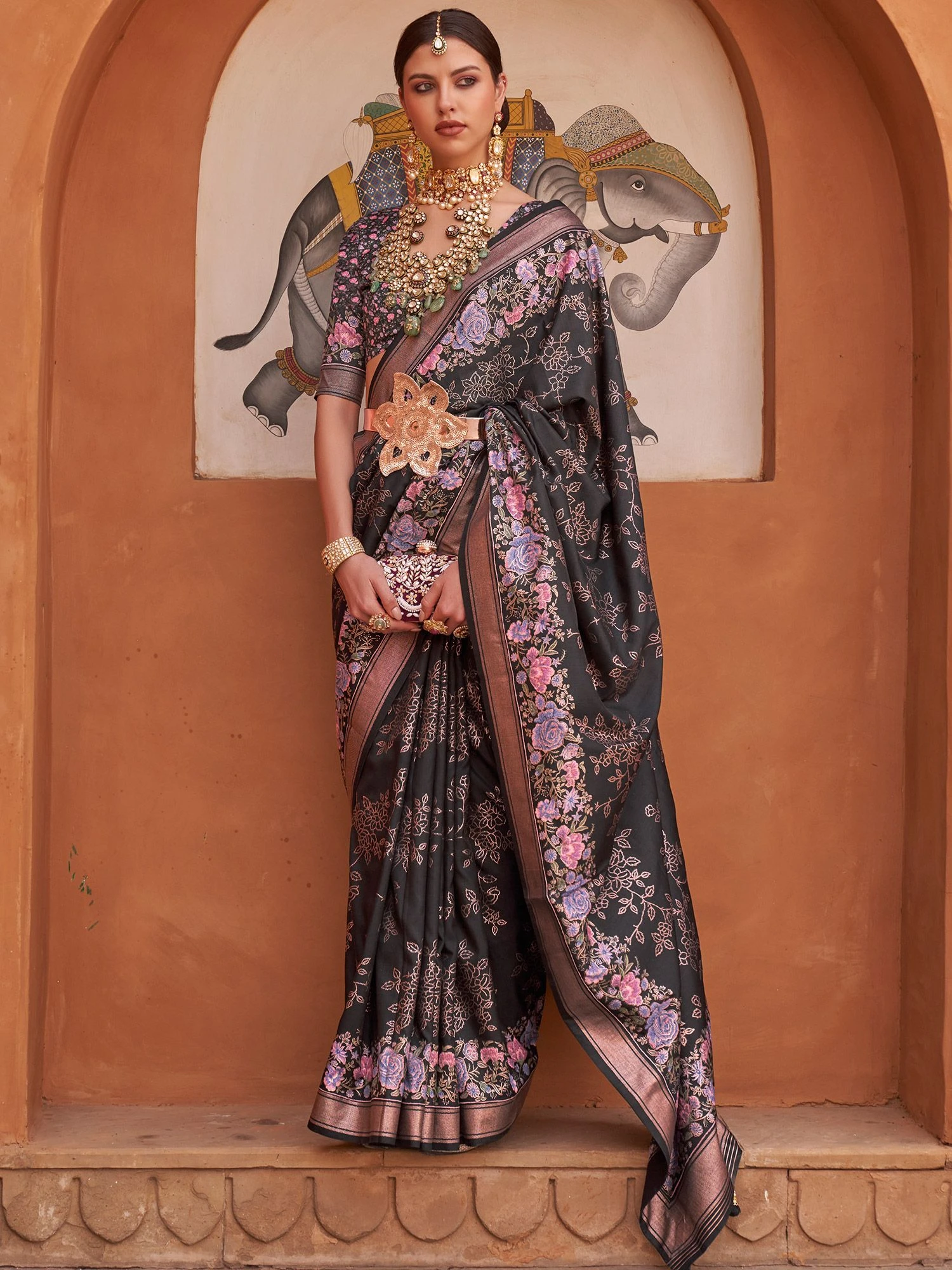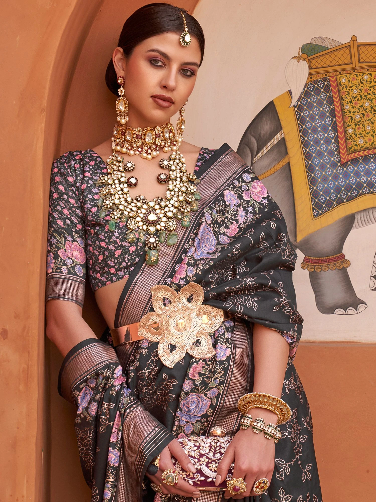 Exude major regal vibes adorning this black color saree designed in silk. Furnished using floral printed patterns, showcasing distinstive borders and pallu. Comes with a matching black color blouse in silk. Note: The accessories featured are purely for fashion purposes. Due to photography reasons, some color variations may occur. The un-stitched blouse may be customized up to 42 inches.