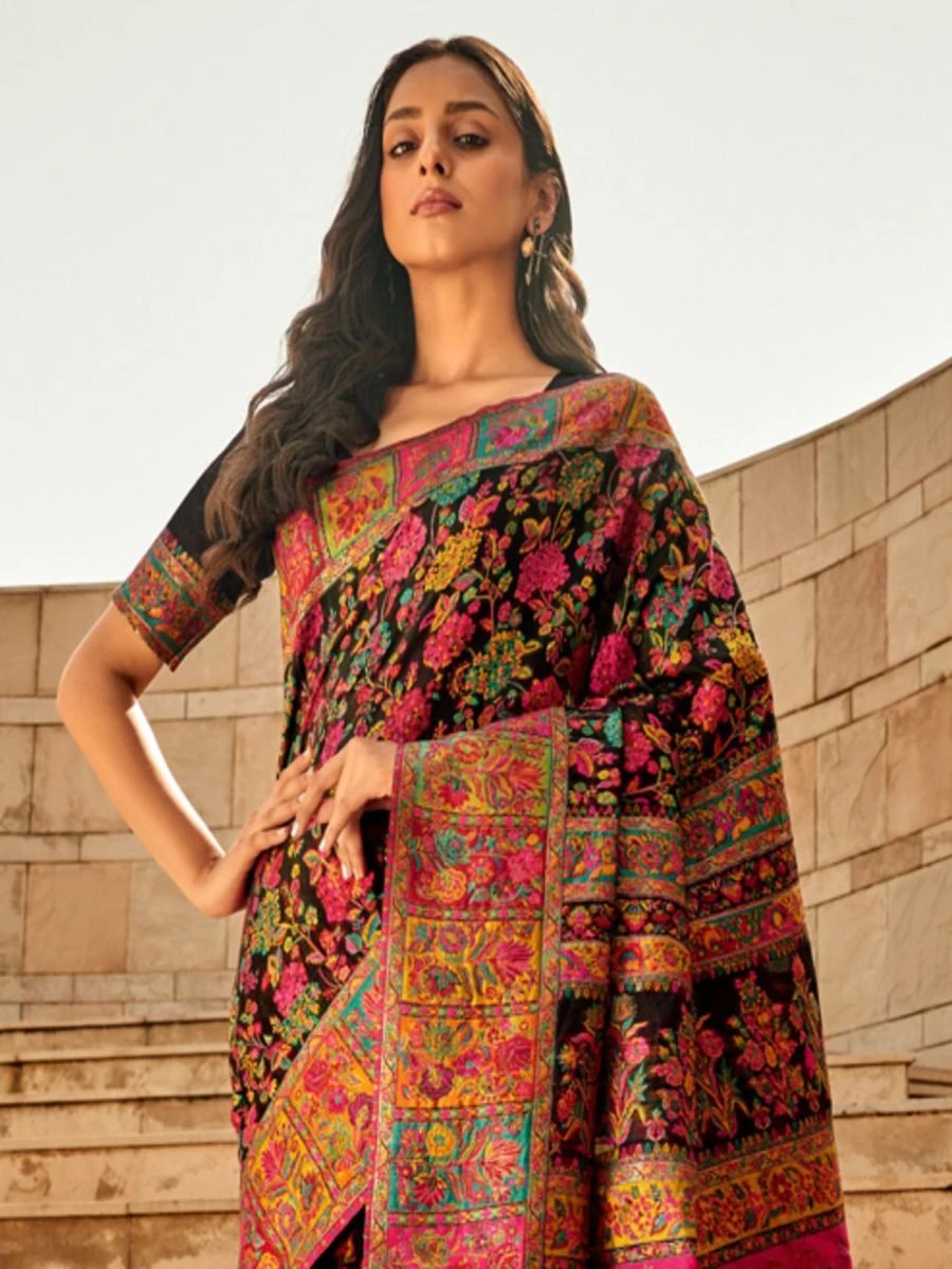 Slay with your classy taste as you wear this black color saree crafted in silk. Designed using floral thread woven patterns, showcasing distinstive borders and pallu. Comes with a matching black color blouse in silk. Note: The accessories featured are purely for fashion purposes. Due to photography reasons, some color variations may occur. The un-stitched blouse may be customized up to 42 inches.