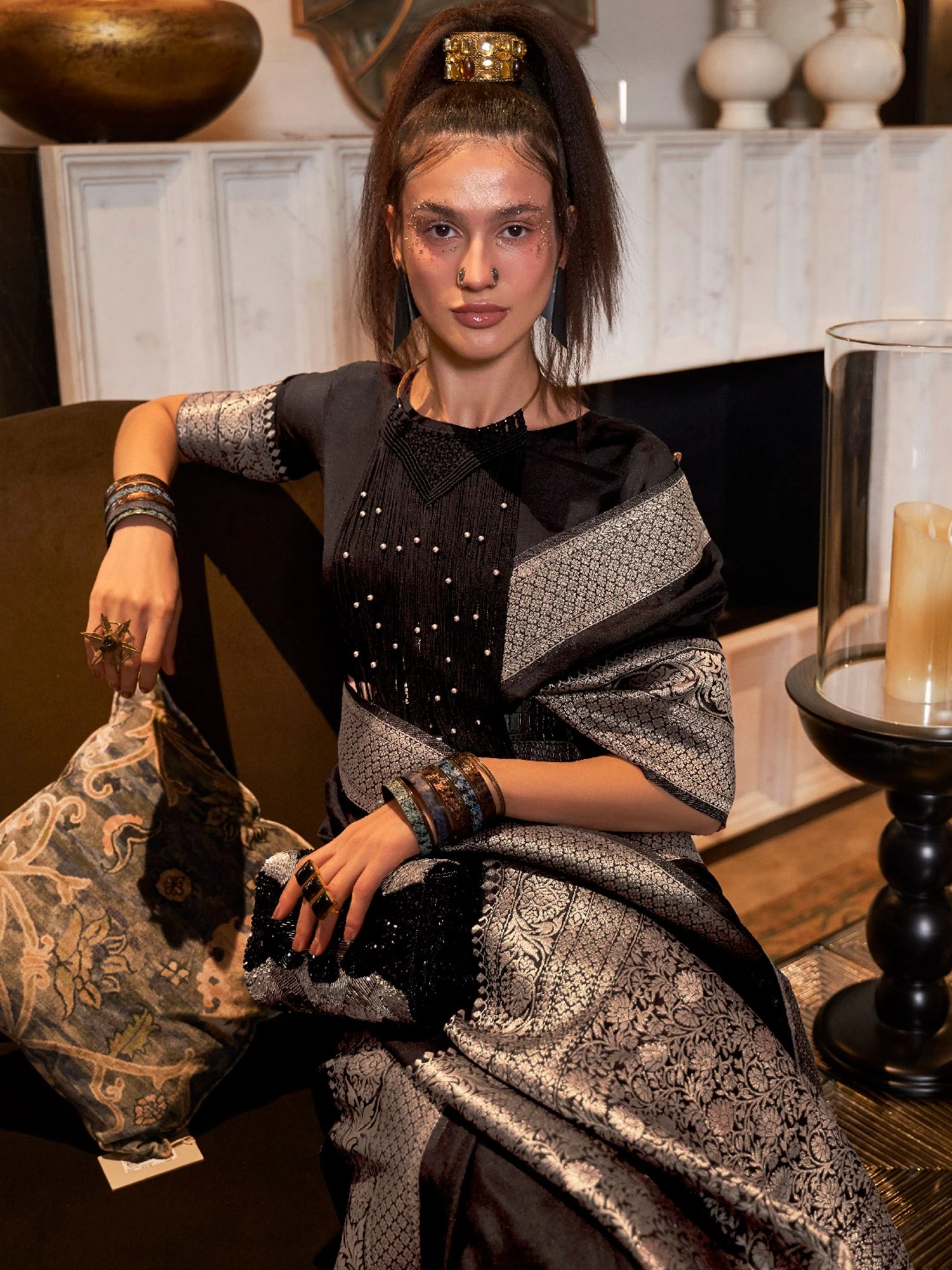 Cherish your look with this black color saree crafted in georgette. Framed using using zari woven patterns, displaying unique borders and pallu. Assembled with a matching black color blouse in georgette. Note: The accessories featured are purely for fashion purposes. Due to photography reasons, some color variations may occur. The un-stitched blouse may be customized up to 42 inches.