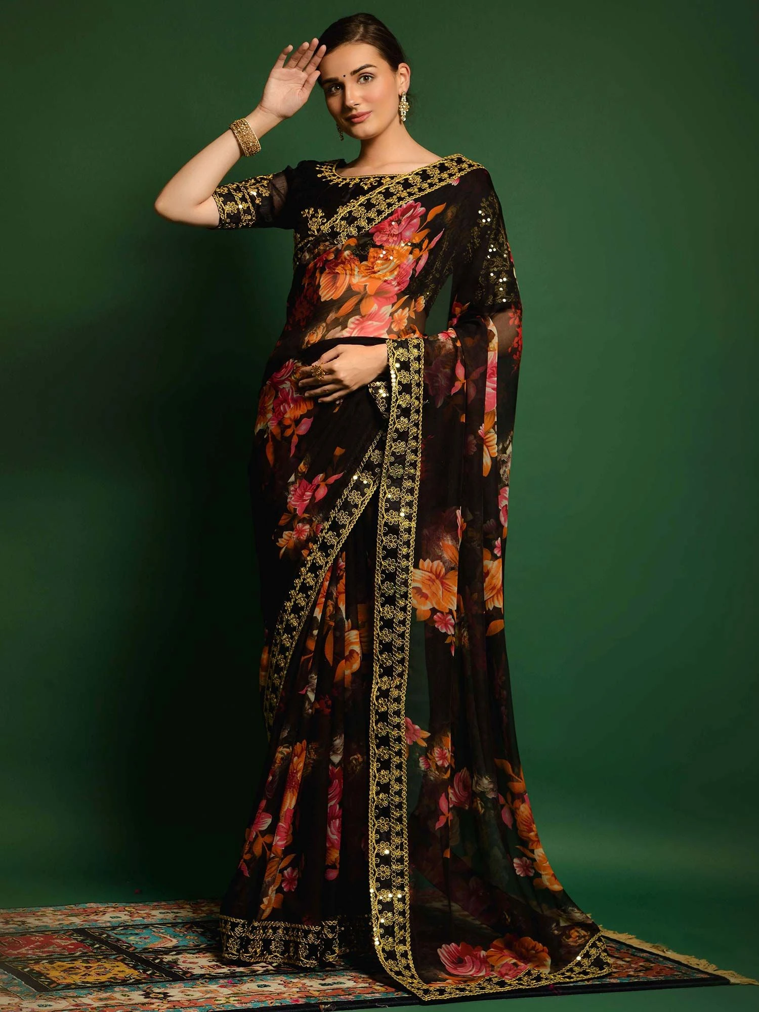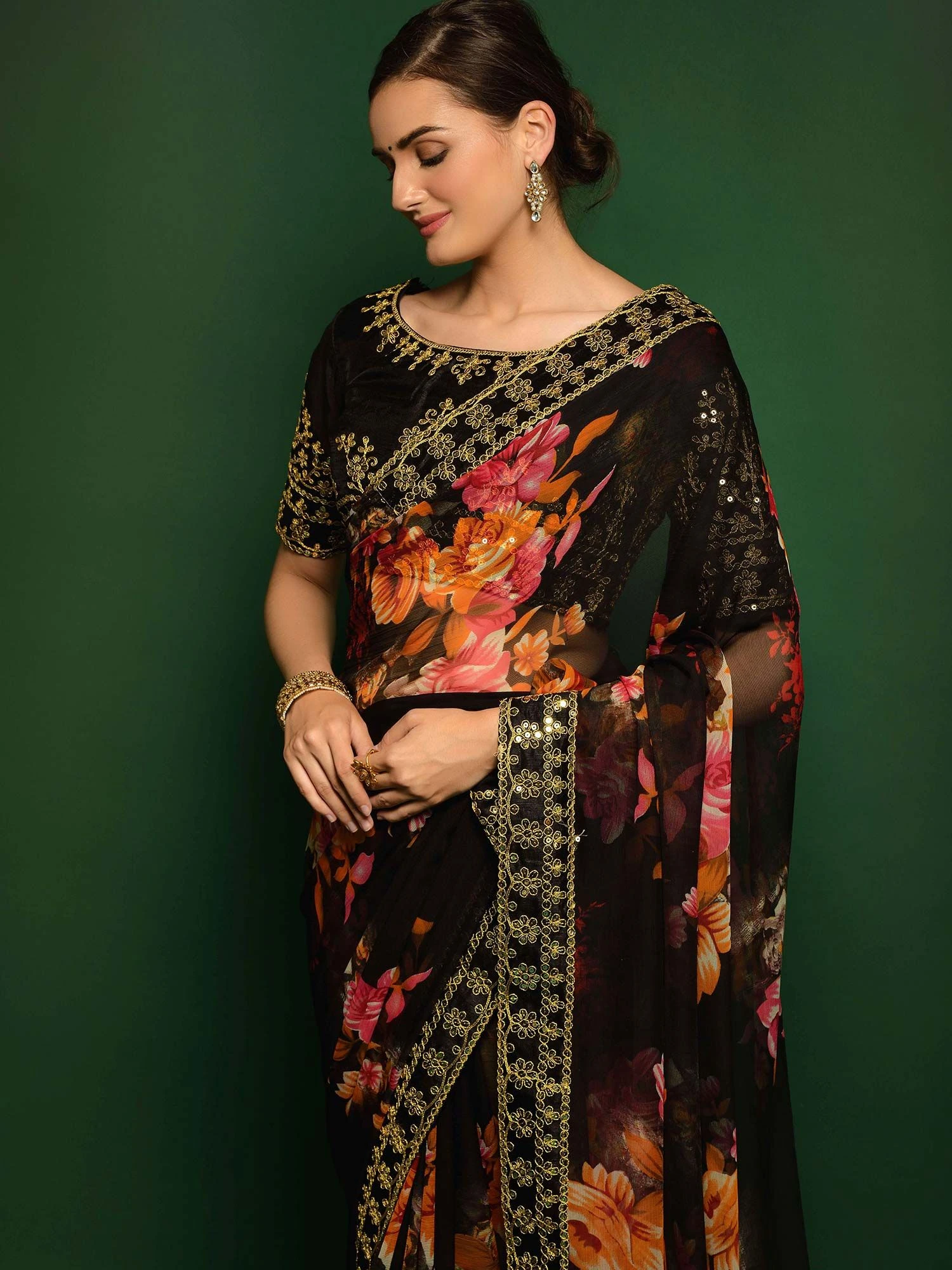 Grab all the attention wearing this black color saree crafted in georgette. Decorated using floral printed patterns, showcasing distinstive borders enhanced with zari and sequins embroidery. Comes with an embroidered black color blouse in georgette. Note: The accessories featured are purely for fashion purposes. Due to photography reasons, some color variations may occur. The un-stitched blouse may be customized up to 42 inches.