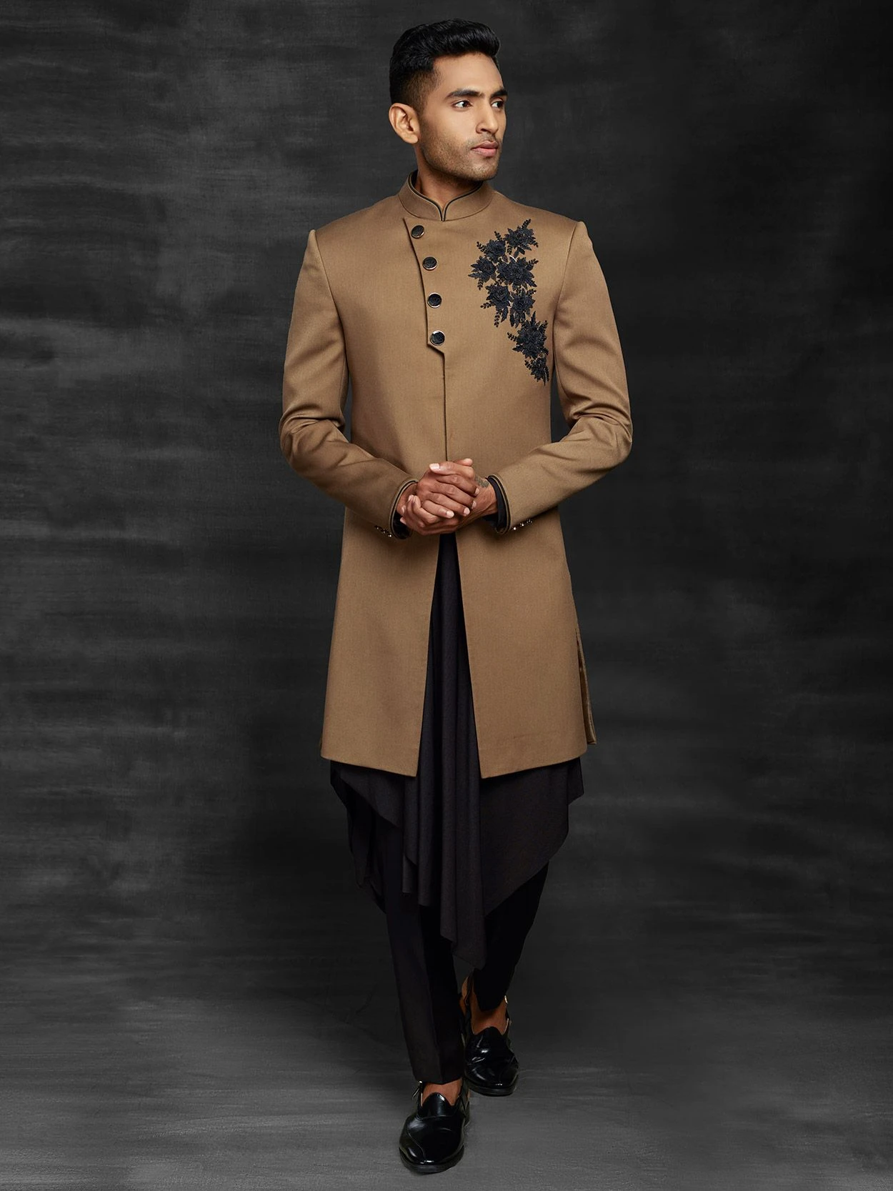 Be The Sunshine Of Anyone Eyes Dressed In Such A Brown Colour Imported Fabric Designer Men’s Indowestern With Matching Kurta And Thread,Hand Work.