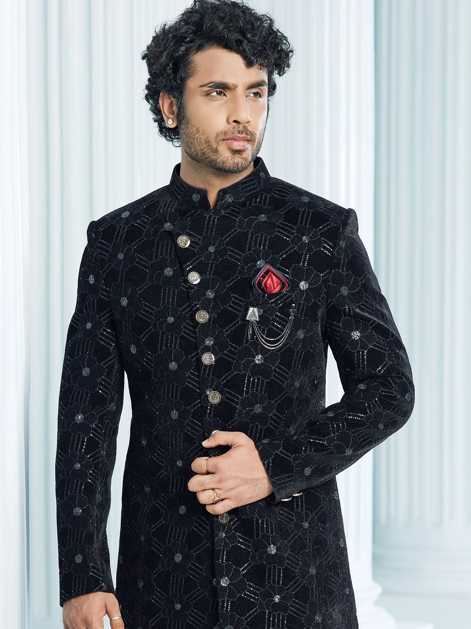 Get the praiseworthy look adorning this dark red color indowestern made in silk. Augmented using thread embroidery with floral embellishment work. Paired with black color churidaar in silk. Note: Some color variations may occur owing to photography causes. Up to 1 inch of measurement fluctuation is possible.