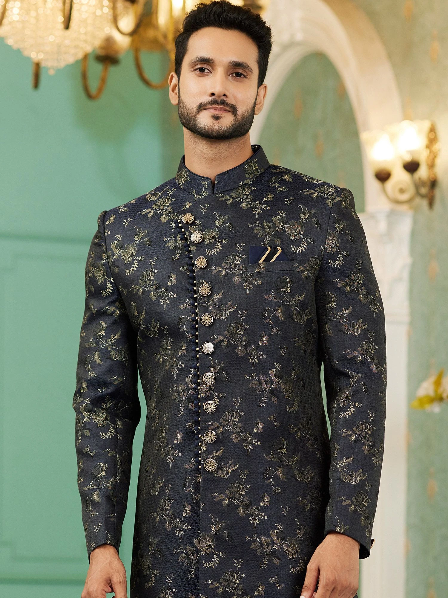 Charm all the hearts adorning this black color sherwani fabricated in jacquard. Designed using floral weaving embroidery work. Paired with white color churidar in dupion silk. Note: Some color variations may occur owing to photography causes. Up to 1 inch of measurement fluctuation is possible.