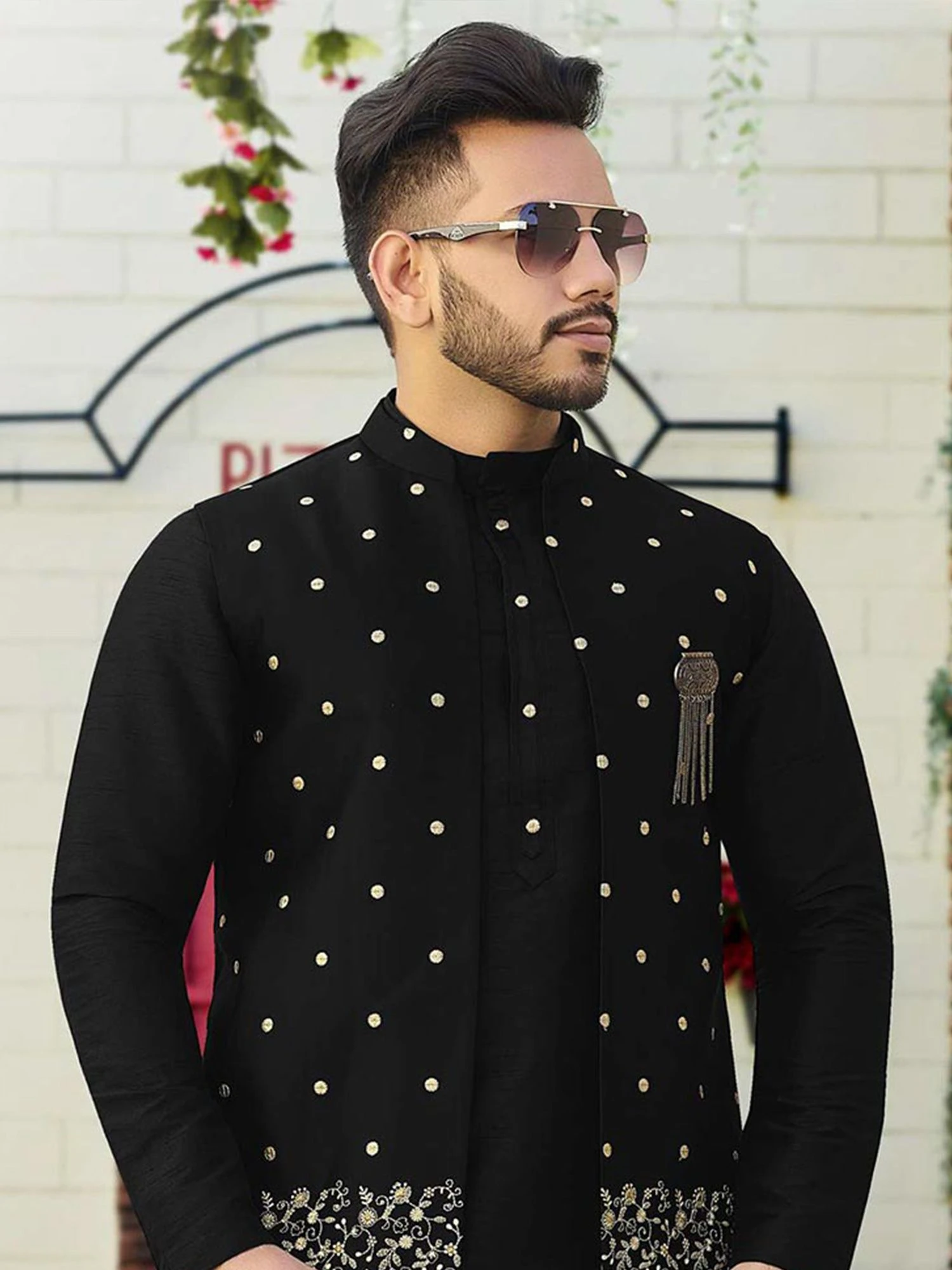 Get set to look regal adorning this black color kurta made in jacquard. Topped with a black jacquard nehru jacket enriched with thread embroidered details. Comes with a black color trouser pants in cotton. Note: Some color variations may occur owing to photography causes. Up to 1 inch of measurement fluctuation is possible.