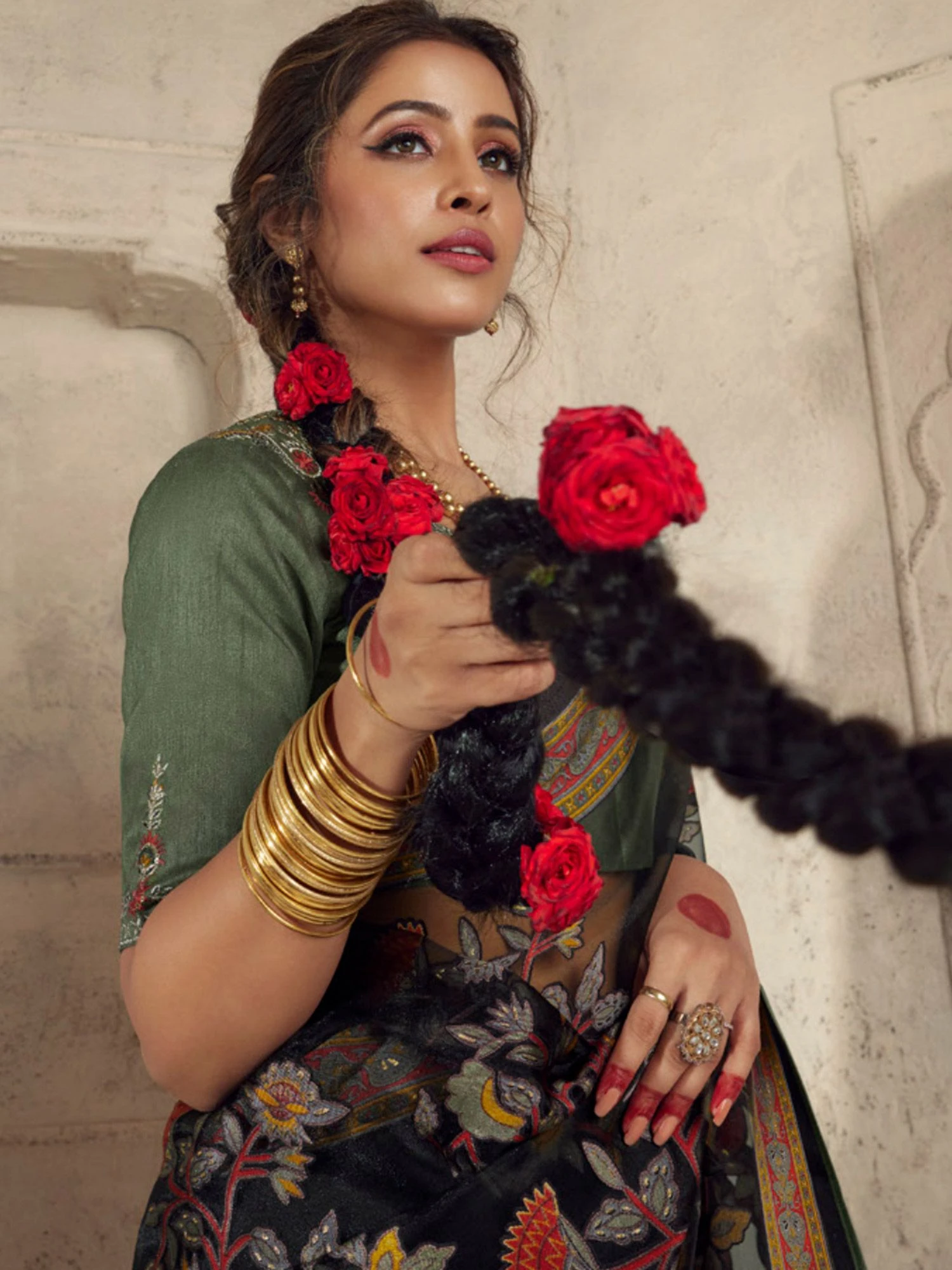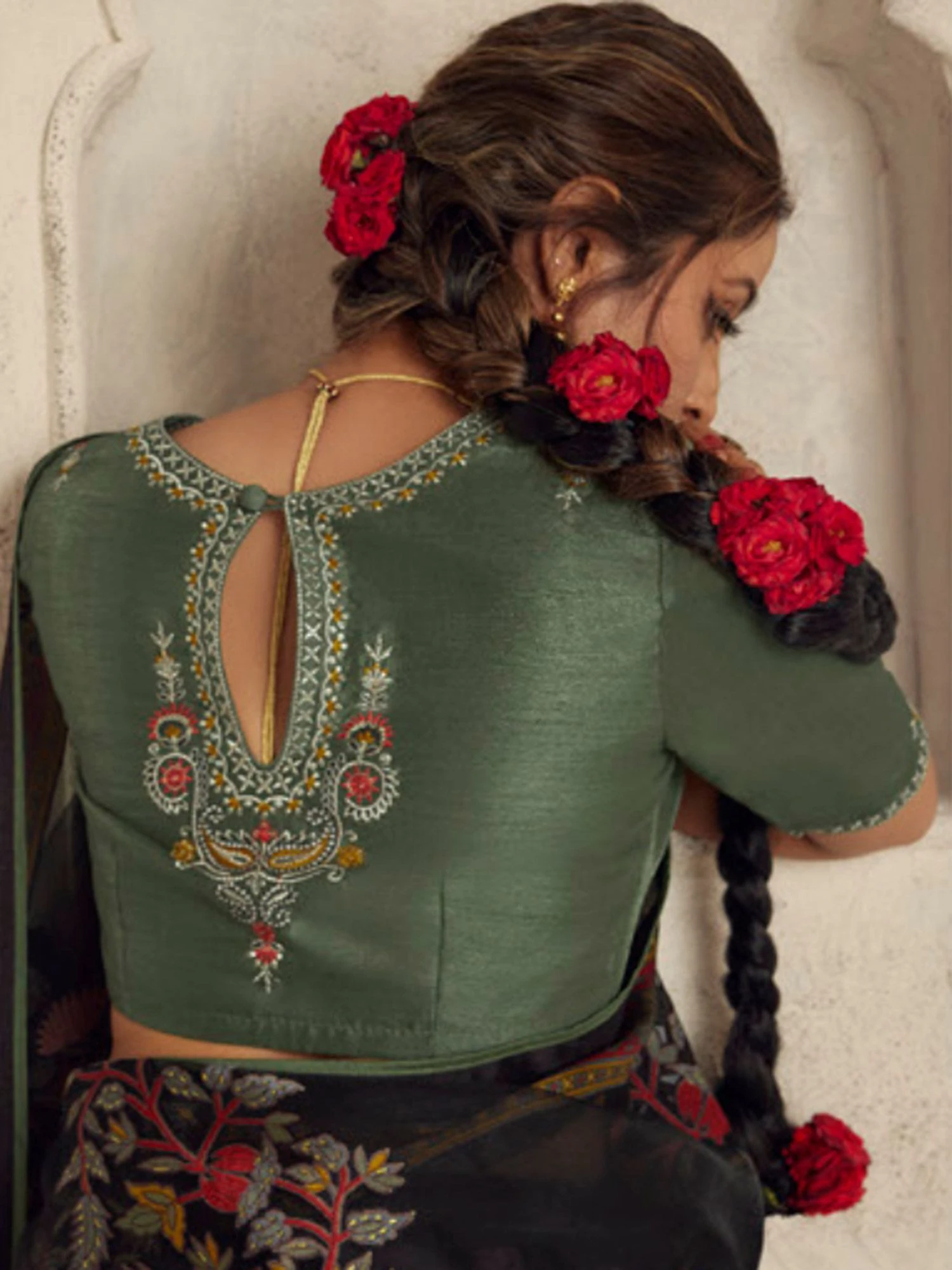 Steal the limelight adorning this black color saree fabricated in brasso. Designed using woven patterns, displaying unique borders and pallu. Comes with a matching olive green color blouse in brasso. Note: The accessories featured are purely for fashion purposes. Due to photography reasons, some color variations may occur. The un-stitched blouse may be customized up to 42 inches.