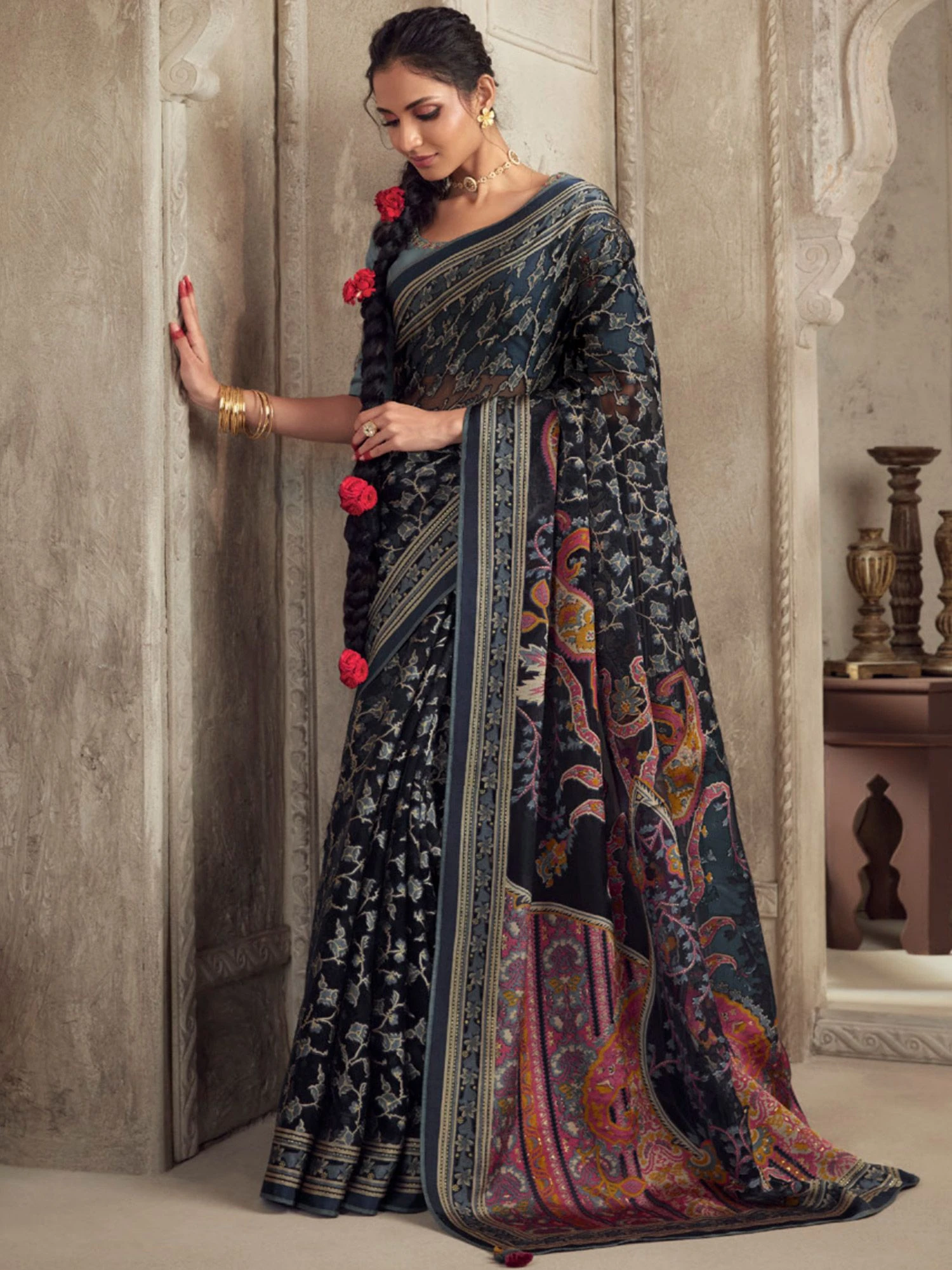 Radiate confidence and poise wearing this black color saree designed in brasso. Augmented using woven patterns, displaying unique borders and pallu. Paired with a matching grey color blouse in brasso. Note: The accessories featured are purely for fashion purposes. Due to photography reasons, some color variations may occur. The un-stitched blouse may be customized up to 42 inches.