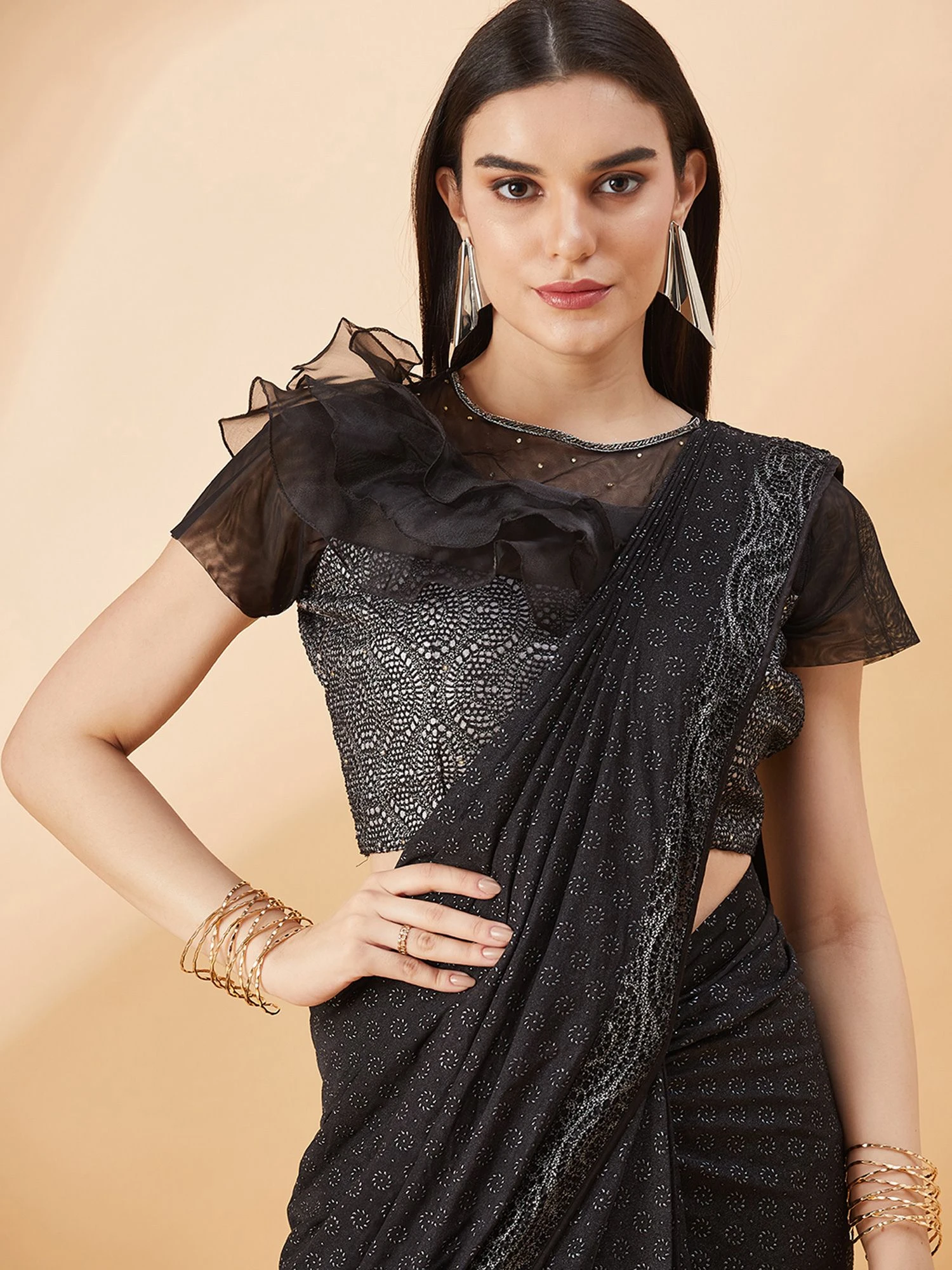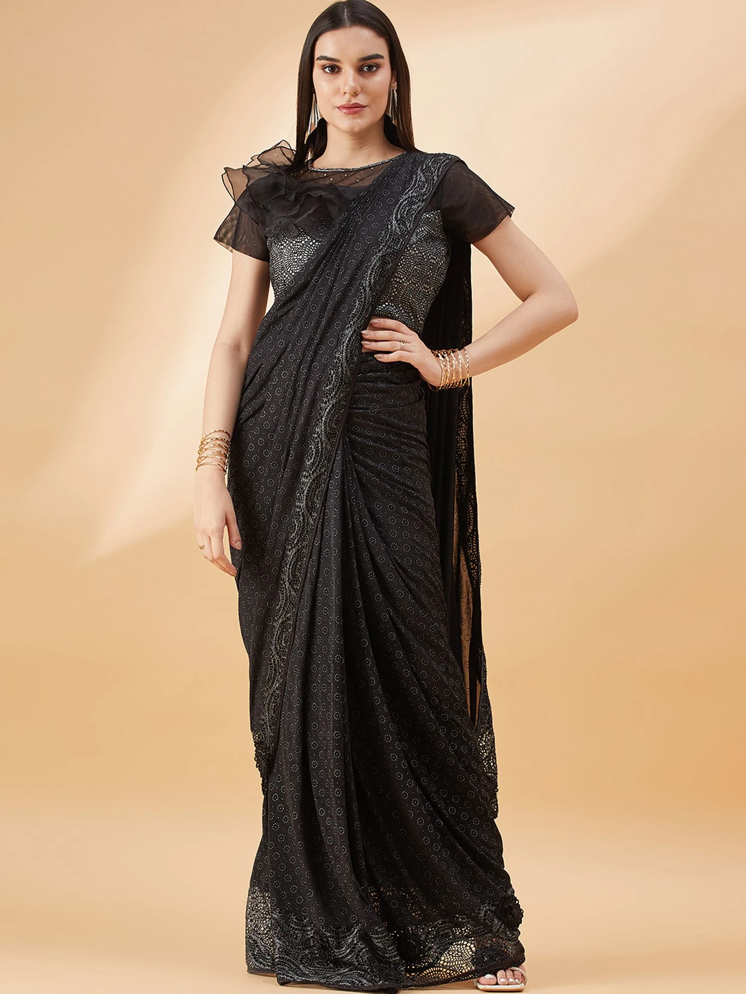 Evoke the diva in you wearing this black color saree crafted in lycra. Enhanced using stone work and printed pattern. Comes with a matching grey color embroiderd blouse in raw silk. Note: The accessories featured are purely for fashion purposes. Due to photography reasons, some color variations may occur. The un-stitched blouse may be customized up to 42 inches.