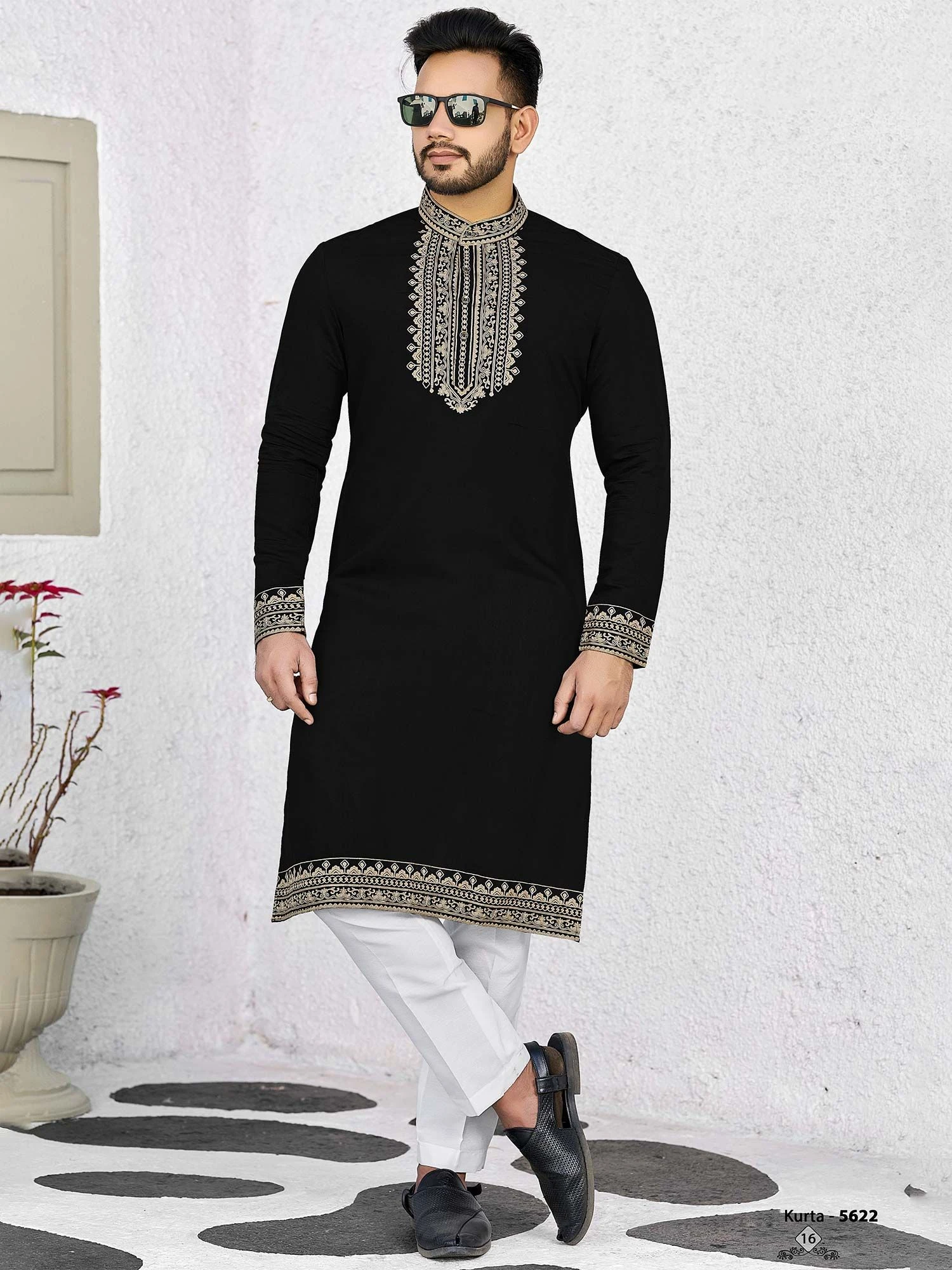 Get set to look regal wearing this black color full sleeved kurta made in jacquard. Furnished with embroidered details along the neckline. Comes with white color trousers in silk. Note: Some color variations may occur owing to photography causes. Up to 1 inch of measurement fluctuation is possible.