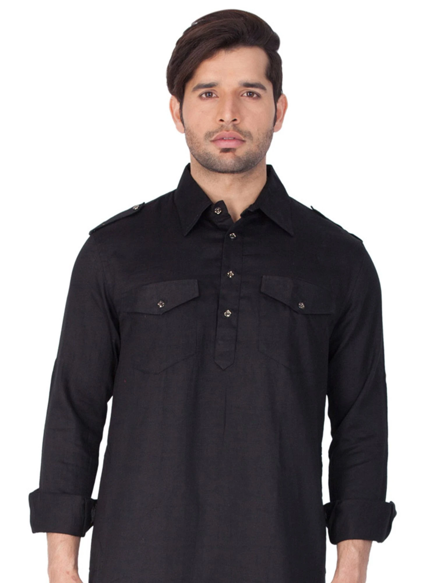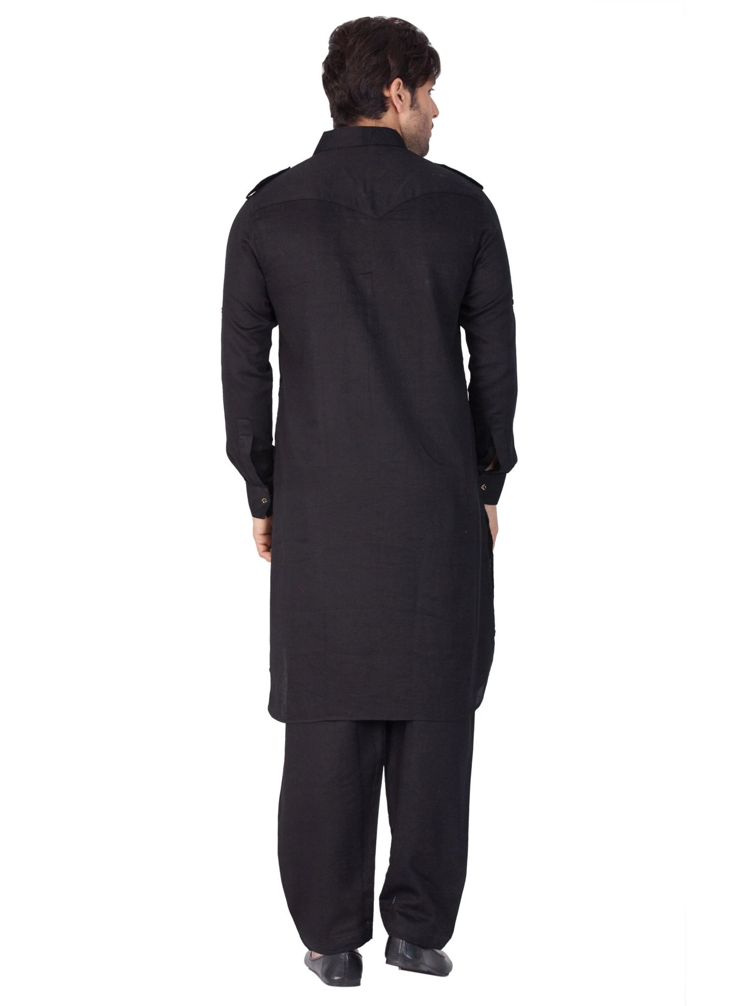 Walk in style adorning this black color kurta made in cotton. Designed with coller pattern and patch pockets. Comes with a black color pathani salwar in cotton. Note: Some color variations may occur owing to photography causes. Up to 1 inch of measurement fluctuation is possible.