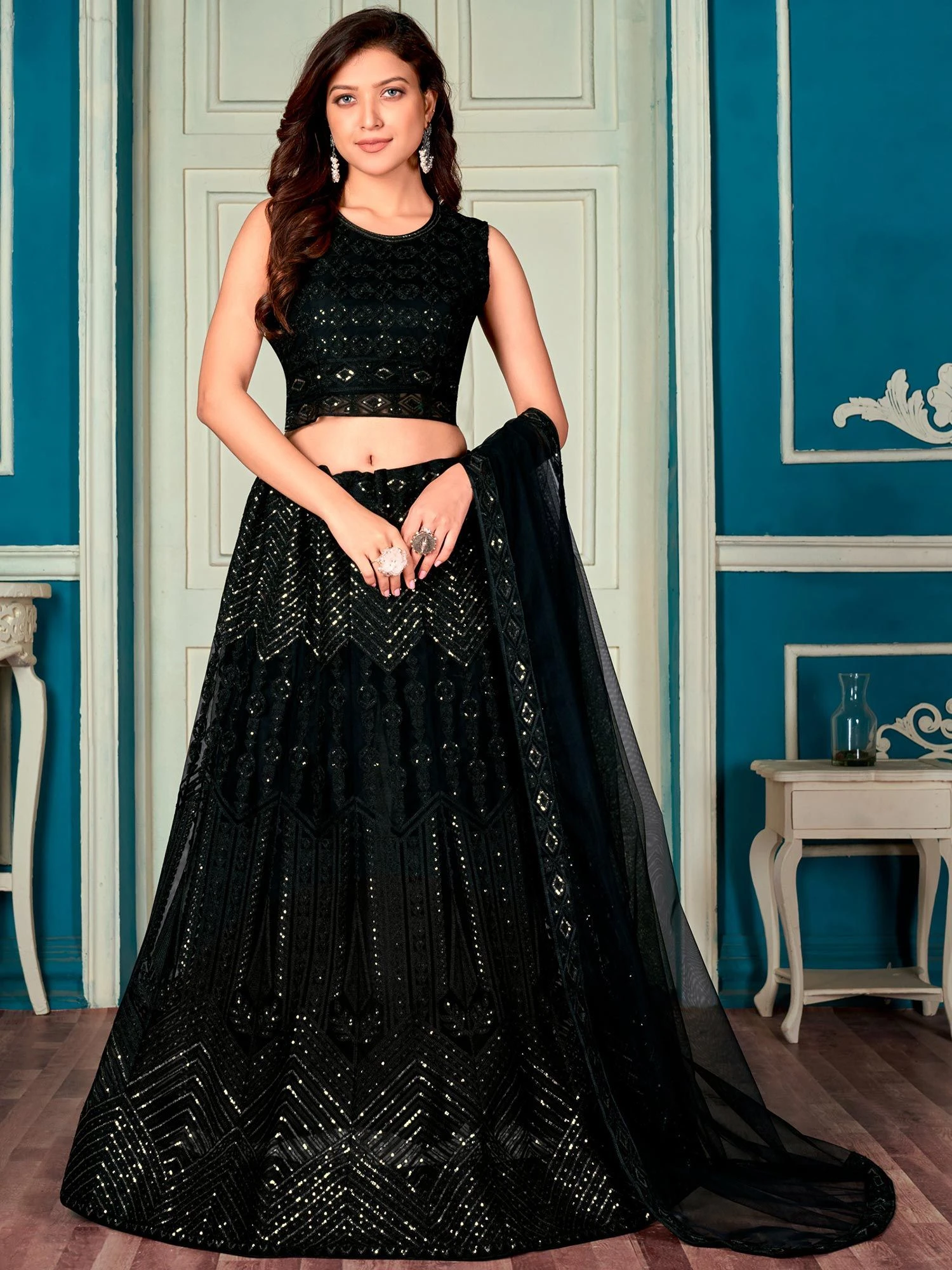 Spread the dazzling sparkles everywhere wearing this black color designer lehenga in net. Decorated with sequins and thread embroidered work. Paired with a matching black color embroidered choli and black dupatta, both made in net. Note: The accessories featured are purely for fashion purposes. Due to photography reasons, some color variations may occur. The semi-stitched choli and lehenga waist may be customized up to 42 inches.