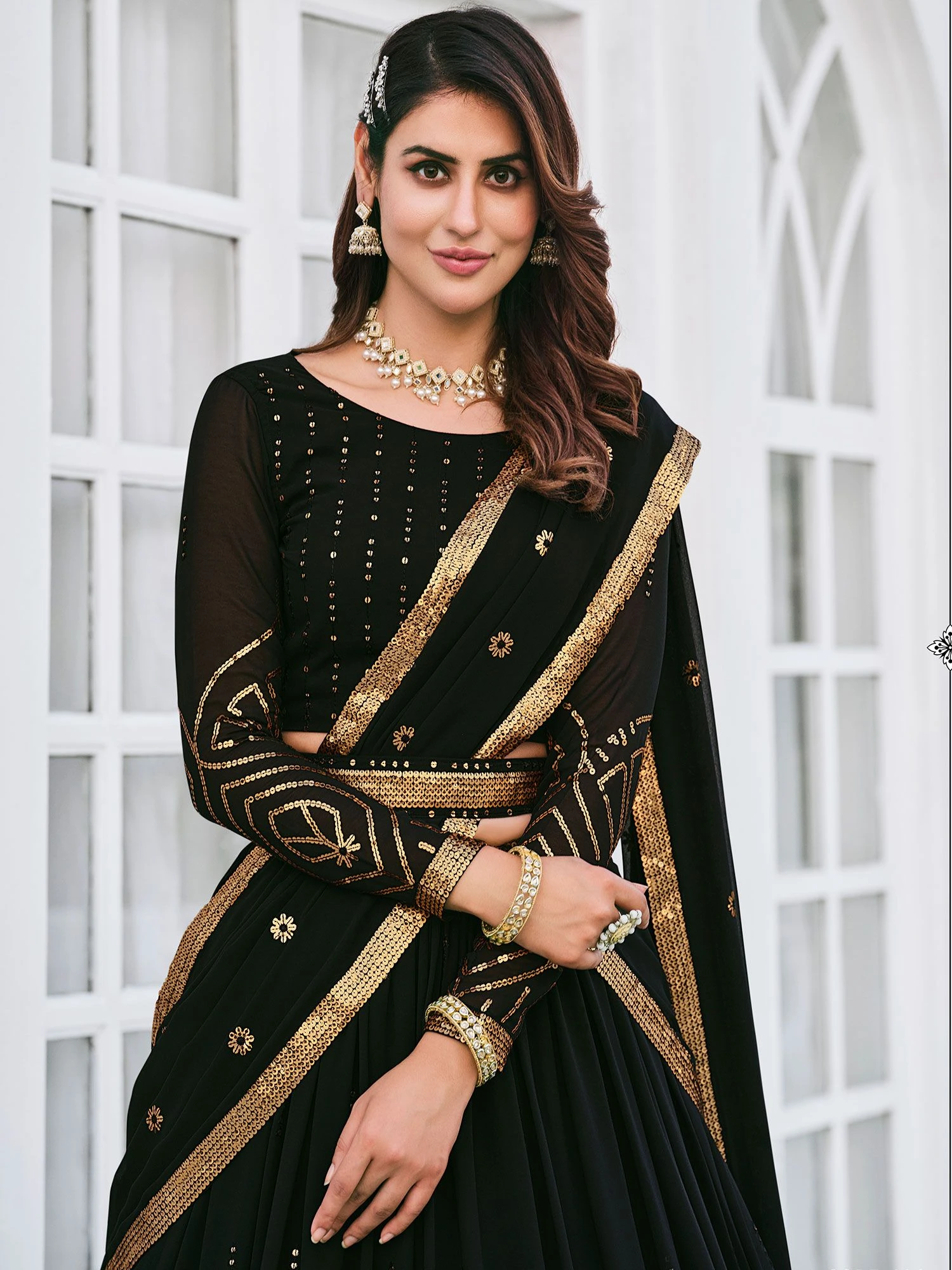 Make a classy statement adorning this black color lehenga in georgette. Designed with sequins and thread embroidered work. Available with a black color embroidered choli, an embroidered belt and black dupatta, both made in georgette. Note: The accessories featured are purely for fashion purposes. Due to photography reasons, some color variations may occur. The semi-stitched choli and lehenga waist may be customized up to 42 inches.