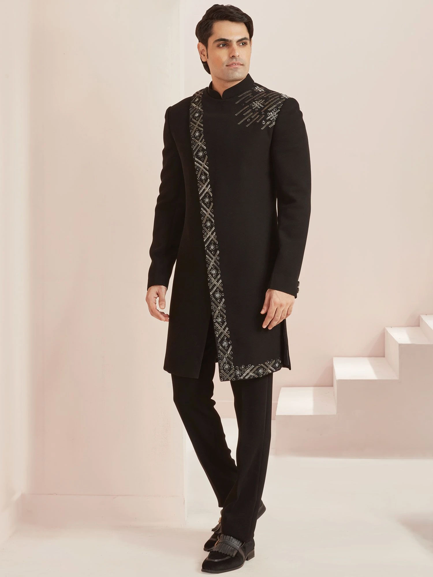 Up your style game with this black color indo western made in silk. Crafted using zari and thread embroidered work. Paired with black color trouser in silk. Note: Some color variations may occur owing to photography causes. Up to 1 inch of measurement fluctuation is possible.
