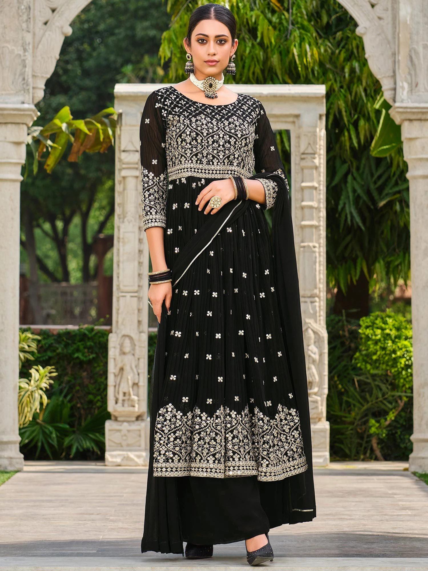 Set yourself a class apart adorning this black color flared kameez in georgette. Designed using sequins and thread work embroidery all over. Paired with a black georgette dupatta and a matching palazzo in georgette. Please note: Accessories shown are for styling purpose only. Slight color variation may occur due to photographic reasons. The semi-stitched kameez can be customised upto 42 inches.