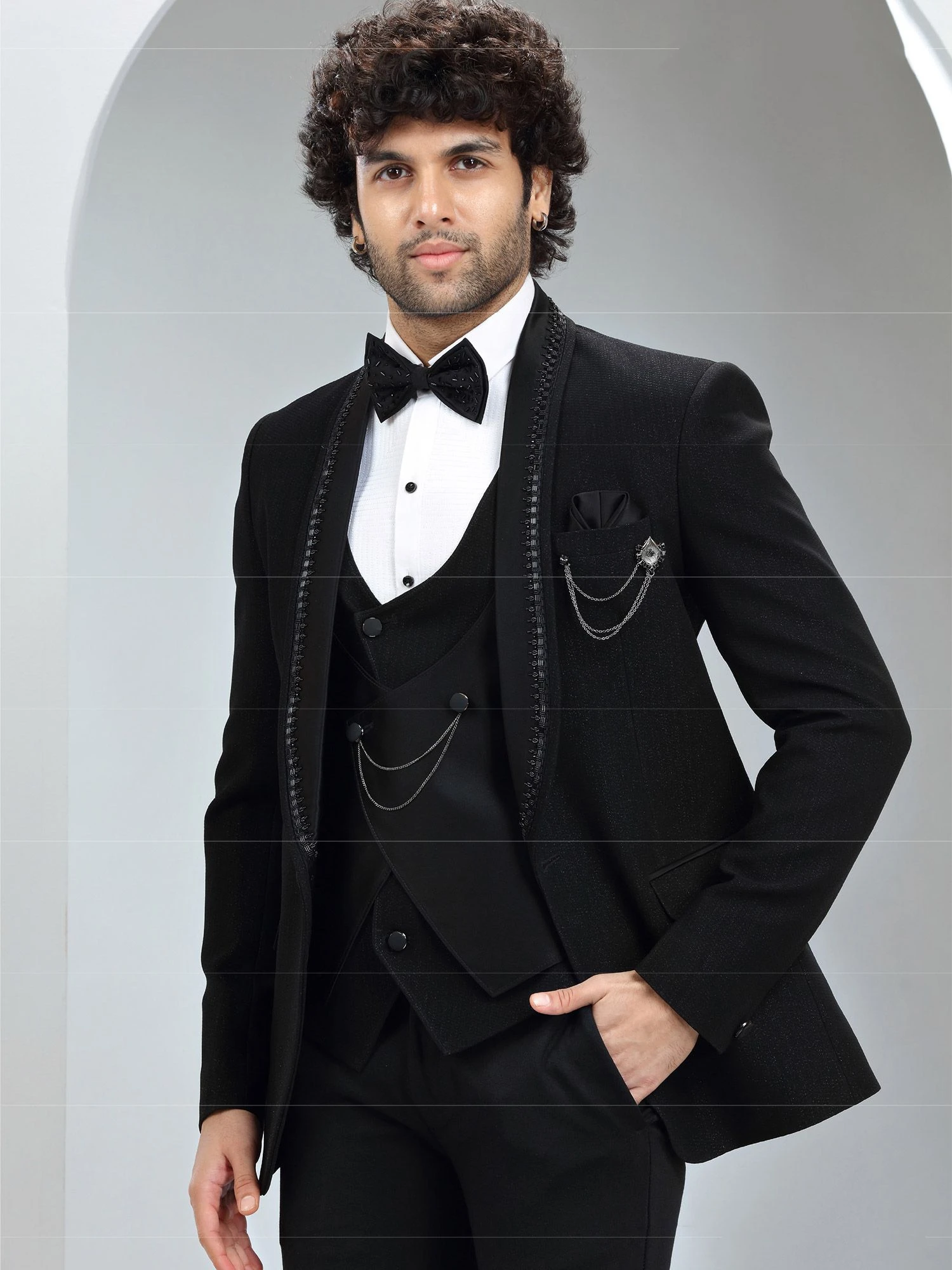 Spreading the sparking vibes with this black color three piece tuxedo made in italian fabric. Furnished with cutdana work embellishments. Paired with a white cotton shirt, bow and a matching black color pant Note: Some color variations may occur owing to photography causes. Up to 1 inch of measurement fluctuation is possible.