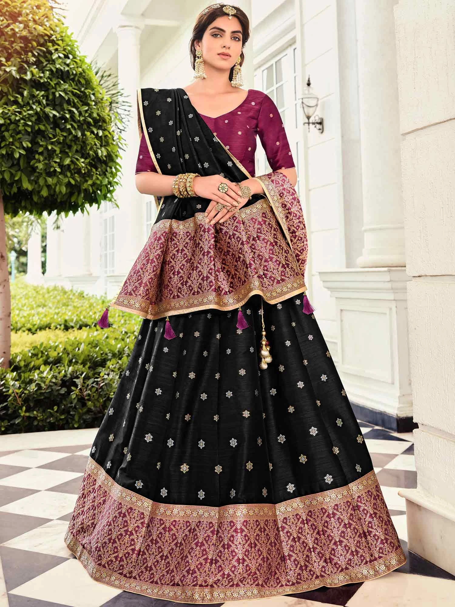 Make a statement adorning this black color lehenga in banarasi silk. Crafted with traditional zari woven patterns. Available with matching purple color banarasi silk choli and black dupatta with similar weaves. Note: The accessories featured are purely for fashion purposes. Due to photography reasons, some color variations may occur. The semi-stitched choli and lehenga waist may be customized up to 42 inches.