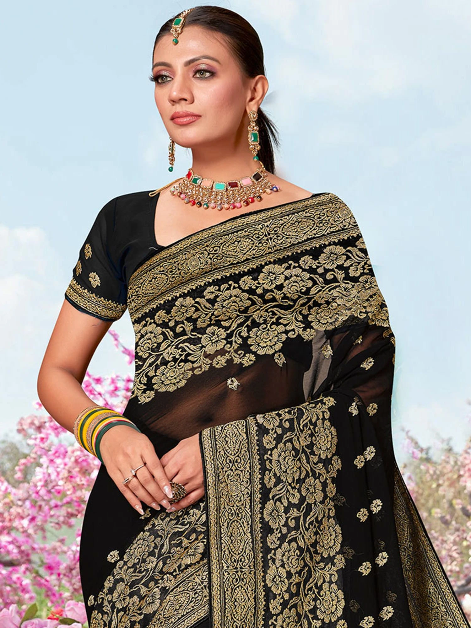 Slay with your classy taste as you wear this black color saree crafted in georgette. Designed using zari woven patterns, displaying unique borders and pallu. Comes with a matching black color zari woven blouse in georgette. Note: The accessories featured are purely for fashion purposes. Due to photography reasons, some color variations may occur. The un-stitched blouse may be customized up to 42 inches.