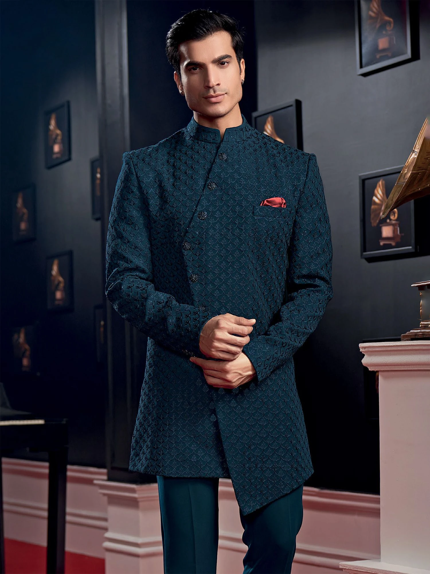 Flaunt a classy demeanor adorning this prussian blue color asymmetric indo western made in italian fabric. Curated using dense thread embroidery work all over. Available with blue color trousers in italian fabric. Note: Some color variations may occur owing to photography causes. Up to 1 inch of measurement fluctuation is possible.