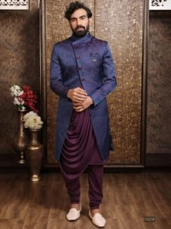 Exude major regal vibes adorning this navy blue color indo western made in jacquard. Enhanced using woven details and asymmetric pattern. Paired with purple color churidaar in silk. Note: Some color variations may occur owing to photography causes. Up to 1 inch of measurement fluctuation is possible.