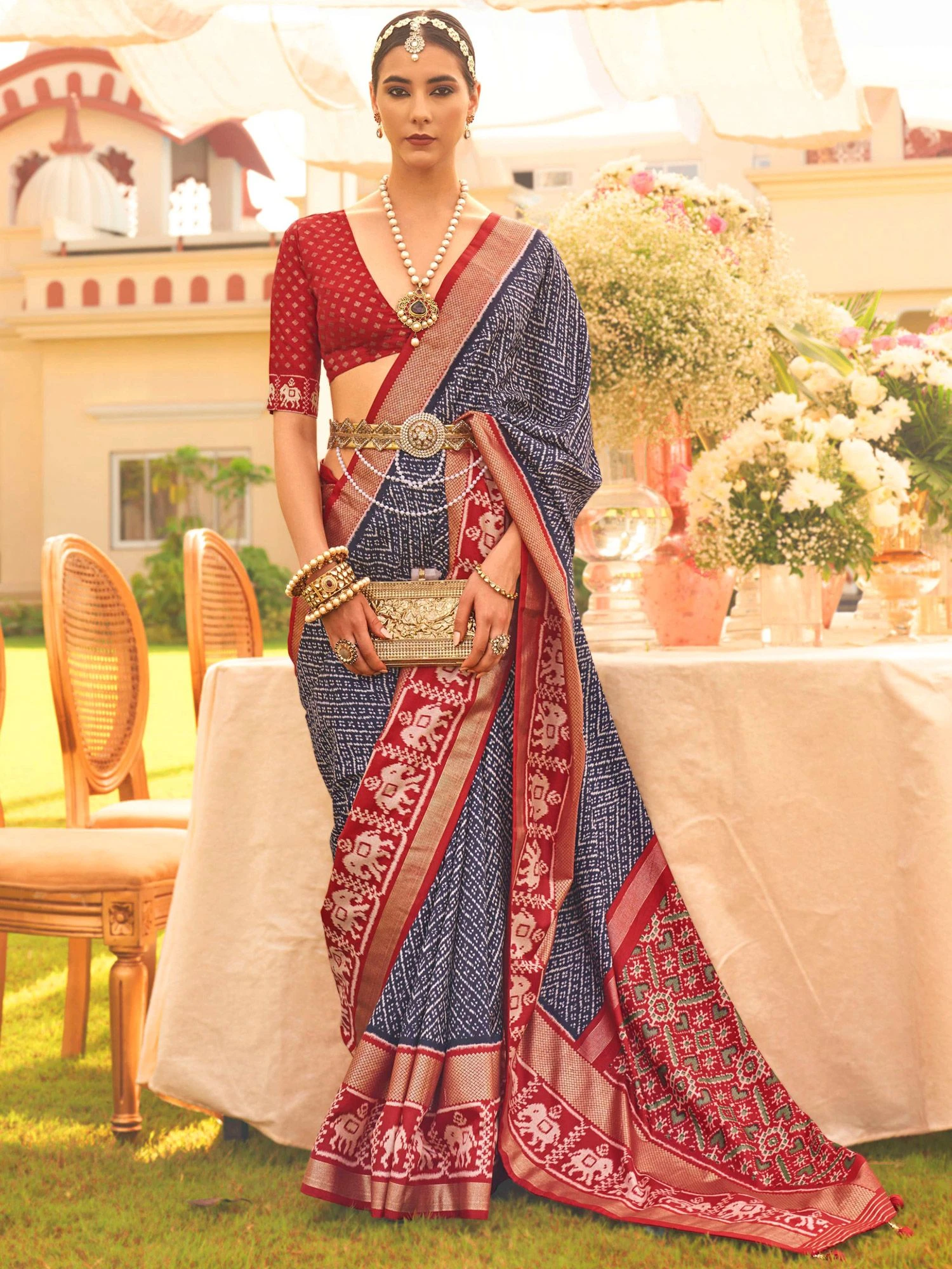 Slay with your classy taste as you wear this berry blue color saree designed in silk. Designed using bandhej print patterns, showcasing distinstive borders and pallu. Paired with a matching red color blouse in silk. Note: The accessories featured are purely for fashion purposes. Due to photography reasons, some color variations may occur. The un-stitched blouse may be customized up to 42 inches.