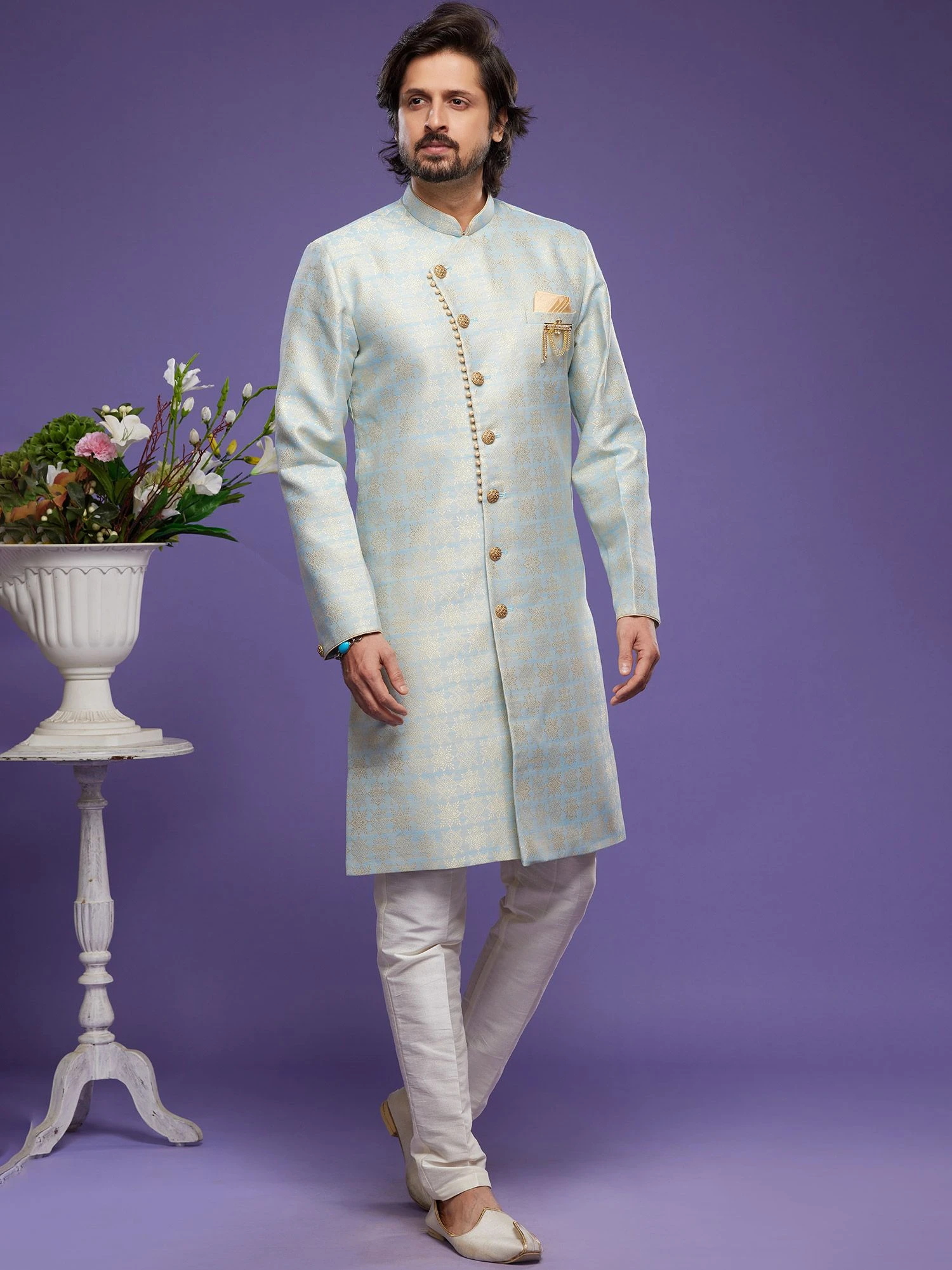 Grace up the whole event adorning this sky blue color indo western made in banarasi silk. Augmented using jacqaurd woven work with buttoned up front. Paired with white color trousers in dupion silk. Note: Some color variations may occur owing to photography causes. Up to 1 inch of measurement fluctuation is possible.