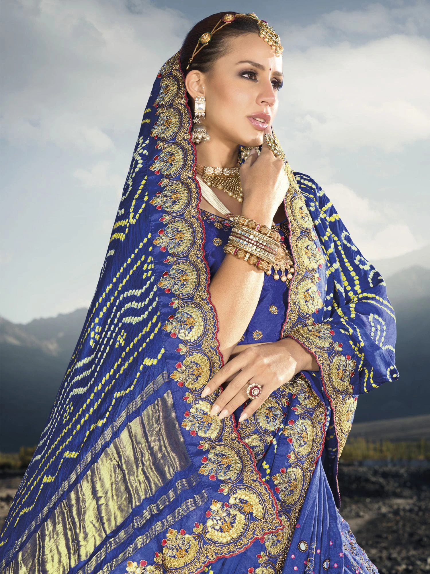 Exude major regal vibes adorning this blue color saree crafted in satin. Furnished using stone with zari embroidered and enhances with bandhani printed, distinctive gota patti emblellished border or zari woven pallu. Comes with a matching blue color blouse in silk. Note: The accessories featured are purely for fashion purposes. Due to photography reasons, some color variations may occur. The un-stitched blouse may be customized up to 42 inches.